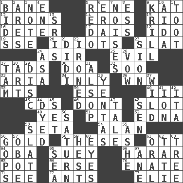 ACROSS 1. Object of repulsion 5. French philosopher Descartes 9. Krazy ___ of comics 12. Metal shackles 14. Greek god of love 15. River (Sp.) 16. Prevent from occurring 17. Raised platform 18. Wedding promise 19. Compass dir. 20. Foolish or stupid persons 23. Narrow board 24. SW Saudi Arabia district 25. Tending to cause great harm 27. Small amounts or degrees 30. ___ good deed 32. "Barney Miller" actor Jack 33. Roberta Peters solo 34. Inwardly 36. Compass dir. 38. Mountains (abbr.) 39. Compass dir. 40. One more than two 43. Music discs 46. Do not 48. Narrow opening 49. It is so 51. Parent Teacher Association (abbr.) 52. Pulitzer Prize-winning author Ferber 53. Stalk of a moss capsule 54. Actor Alda or Thicke 56. Precious metal 58. College papers 61. Baseball player Mel 64. Chief or king in Benin or Nigeria 65. Chop _ 66. Ethiopian city, capital of Harari 68. Plant holder 69. Celtic language 70. Related on the mother's side 71. Observe 72. Pismires 73. Writer Wiesel DOWN 1. Auction offers 2. Ancient Greek god of war 3. Brief written record 4. Compass dir. 5. Do over again 6. Part of Q.E.F. 7. Annoying sounds 8. Double-curved letter 9. The principal food of baleen whales 10. Opera by Verdi 11. A blast of a horn 13. Indian titles of respect 21. "You Light Up My Life" star Conn 22. Pressed 23. The Jewish people; Israel 24. White ___ sheet 26. Solemn pledge 27. Scottish cap 28. Nonscientific branch of learning 29. Flat circle 31. Columnist Joseph or Stewart 35. Gossips 37. Rampant 41. Electrically charged atom 42. Call ___ day 44. Colored 45. Put into a specified state 47. Falsehood 48. Elected rep. 50. Titan orbits this 53. Chalkboard 55. American tennis player Robert 56. Republicans 57. Mitch Miller's instrument 59. Command 60. Snake ____ (dice throw) 61. Spoken 62. Jacques of French films 63. Family _ (genealogy) 65. Ocean 67. One (Scot)