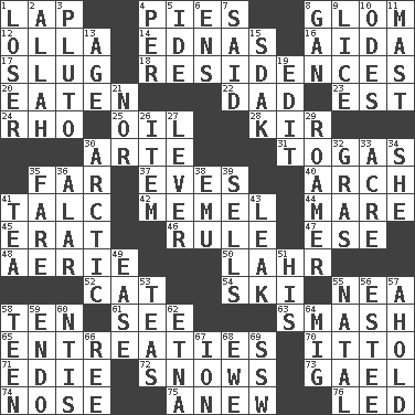 ACROSS 1. Pet locale 4. Sliced desserts 8. Take by theft 12. Rounded earthenware pot or jar 14. Ferber et al. 16. Opera by Verdi 17. A hard, heavy blow 18. Homes 20. Ingested 22. June honoree 23. Eastern Standard Time (abbr.) 24. 17th letter of the Greek alphabet 25. Petroleum 28. Apertif with cassis 30. Johnson of "Laugh-In" 31. Ancient Roman robes 35. Distant 37. Nights before holidays 40. Bowlike part 41. Baby powder 42. Klaipeda city 44. Female horse 45. Part of Q.E.F. 46. Governing power 47. Compass dir. 48. Nest on high 50. Cowardly lion portrayer 52. Feline 54. What Jean-Claude Killy likes to do 55. Teachers' org. 58. Nine, plus one 61. Perceive with the eye 63. Box-office sellout 65. Pleas 70. "Tell ____ the Marines!" 71. Singer Brickell 72. Frozen precipitation (plural) 73. Highlander 74. Sense of smell 75. Afresh 76. Directed DOWN 1. Failure 2. Assad's deity 3. Greek god of the underworld 4. For each 5. Binary compound 6. Followers of ems 7. Stated 8. Separate the seeds from cotton 9. Louse (plural) 10. Lyric poems 11. Vertical spar for supporting sails 13. Grow older 15. Neighbor of Neb. 19. Prepare for publication 21. And not 26. A whole individual unit 27. Prying instrument 29. Nomad 30. Northern region 32. Pate de foie ____ 33. Measure of real estate 34. A female animal or person 35. Conductor's collection 36. Having or resembling wings 38. Australian flightless bird 39. Makes a sale 41. Beverage made from leaves 43. Path through which fluid escapes 49. Relaxation 51. Part of HMS, perhaps 53. Beverages made from leaves 55. Brizilian seaport 56. First name in cosmetics 57. Hold, grip (Informal) 58. Adolescent 59. Inside; within (prefix) 60. Nuclear Threat Initiatives 62. Inactive volcano in Sicily 64. Russian fighter aircraft 66. To riddle 67. Electrically charged atom 68. She-sheep 69. Compass dir.