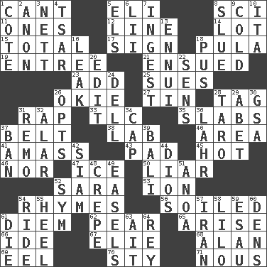 ACROSS 1. Patter 5. Biblical high priest 8. _-fi 11. Singles 12. Actor's bit 14. Car dealer's back yard 15. "_____ Recall" 17. Signal 18. Monetary unit of Botswana 19. Main course 21. Took place subsequently 23. Find the sum of 25. Takes to court 26. Migrant worker of the '30s 27. Shallow baking pan 28. Label 31. Reproach for some lapse or misdeed 33. Affectionate concern, for short 35. Thick slices 37. Waist strap 38. Experiment locale 40. Length times width 41. Collect or gather 43. Groovy apt. 45. Being at a high temperature 46. Or not 47. Frozen water 50. One who doesn't tell the truth 52. "Two Mules for Sister ____" 53. Electrically charged atom 54. Poems 56. Dirtied 61. South Vietnam president (1954) 62. Lightbulb-shaped fruit 65. Get up 66. Binary compound 67. Writer Wiesel 68. Actor Alda or Thicke 69. Snakelike fish 70. Filthy place 71. Good sense DOWN 1. ____ d'Azur (French Riviera) 2. At once, immediately (arch.) 3. Remaining after all deductions 4. Russian ruler of old 5. Raised railways 6. Cards in a Roman deck? 7. Eat 8. Change direction abruptly 9. Chilled 10. Call ___ day 13. World-weariness 16. Path through which fluid escapes 18. Tenth month of the Hindu calendar 20. Prepare for publication 22. Elected reps. 24. Small valley 26. Elects 28. Pacific island yam 29. Collude with 30. Girls' org. (abbr.) 31. San ____ (Riviera town) 32. Having or resembling wings 34. Head covering 36. Cowardly lion portrayer 37. Bar 39. Indonesian resort city 42. Thailand, formerly 44. "Vaya con ____" 48. Streamer paper 49. Artist's stands 51. Small Philippine buffalo 52. Symbol (abbr.) 54. Travel on or in a vehicle 55. The bottom of a shoe or boot 57. SW Asia republic 58. _ and Stitch 59. Son of Isaac 60. Habitations of wild animals 61. Expire 63. Small island 64. Marina Del _, California