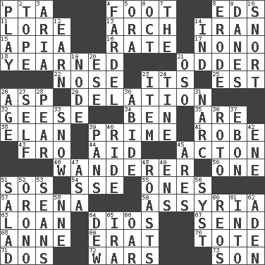 ACROSS 1. Parent Teacher Assoc. 4. One third of a yard 8. Begley and Asner 11. Old wives' tales, e.g. 13. Bowlike part 14. SW Asia republic 15. Capital of Western Samoa 16. Assign a rank or rating to 17. Words to Nanette 18. Had a strong desire 21. More peculiar 22. Sense of smell 23. It is 25. Eastern Standard Time (abbr.) 26. Cleo's killer 29. Conveyance 32. Honkers 34. Benjamin's nick name 35. "We ___ not amused" (Victoria) 38. Flair 39. A-one 41. Loose flowing garment 43. Away 44. Help 45. Gambison 46. Roamer 50. Single 51. Mayday 54. Compass dir. 55. Singles 57. Sports stadium 59. Nineveh was its capital 63. Grant temporary use of 64. "Vaya con ____" 67. Post 68. Queen of England 1702-14 69. Part of Q.E.F. 70. Carry 71. Two (Sp.) 72. Armed conflicts 73. Manchild DOWN 1. Shaw product 2. Drink excessively 3. Operatic vocal solo 4. Burden 5. Mouth or opening 6. Sep. follower 7. Definite Article 8. Eat (away) 9. Natives or inhabitants of Denmark 10. Derisive sound 12. Merit 14. Indiana (abbr.) 19. Thickened enlargement 20. Compass dir. 21. Bear (Spanish) 23. A distinct part 24. Prong on a fork 26. Personal question 27. Automatically 28. Lightbulb-shaped fruit 30. Remain 31. Drug cop 33. Frozen precipitation 36. Printing process, for short 37. Inky black, to poets 39. Baking dishes 40. Travel on an animal 42. Compass dir. 45. Ancient Greek god of war 47. White ___ sheet 48. Exposes to great heat 49. Followers of ems 51. First course 52. U. of Maine site 53. Actors Connery and Penn 56. System (abbr.) 58. Compass dir. 60. Vintage cars 61. To the inside or interior of 62. An important port of Yemen 64. Morning condensation 65. Retirement account (abbr.) 66. Boat paddle