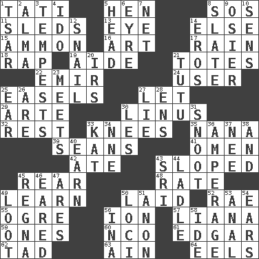 ACROSS 1. Jacques of French films 5. Layer 8. Distress signal 11. Bobsleighs 13. Sight organ 14. Otherwise 15. ID or VA city 16. Nonscientific branch of learning 17. Water falling in drops from the sky 18. Hit sharply and swiftly 19. Assistant 21. Hauls 22. Arab leader 24. One who makes use of a thing 25. Artist's stands 27. Allow 29. Johnson of "Laugh-In" 30. "_ and Lucy" (Charlie Brown theme song) 32. Take ten 33. Leg joints 35. Nanny 39. Actors Connery and Penn 41. Sign of things to come 42. Had dinner 43. Inclined 45. Buttocks 48. Pace 49. Acquire or gain knowledge or skills 50. Put down 52. Actress Charlotte 55. Legendary monster 56. Electrically charged atom 57. Climbing, woody, usually tropical vines 59. Singles 60. Non-commissioned officer (abbr.) 61. _ Allan Poe 62. Small amount or degree 63. The 18th letter of the Arabic alphabet 64. Snakelike fish DOWN 1. Russian ruler of old 2. _ mater 3. Storms 4. Wedding promise 5. Froth on beer 6. Jane of fiction 7. Fish or hair follower 8. Chalkboard 9. Flexible twig of a willow tree 10. Elected reps. 12. Slow-paced one 14. Greek god of love 20. Big collection agency 21. Ballerina skirt 23. Confronts 25. Hearing organ 26. "We ___ not amused" (Victoria) 27. Whopper 28. Followers of ems 30. French article 31. Snob 33. Krazy ___ of comics 34. Compass dir. 36. Electrical Measurement 37. Born 38. Added to 40. Merit 43. _ Lanka 44. Dipping utensil 45. Canadian anthropologist Darnell 46. Having ears or earlike features 47. Ancient Greek god of war 49. Spoils 50. Event scenes 51. At once, immediately (arch.) 53. Of or related to the anus 54. Hearing organs 56. _ tizzy (2 wds.) 58. Binary compound