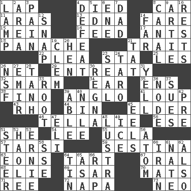 ACROSS 1. Infant locale 4. Passed on 8. 4-wheeled motor vehicle 11. Caspian sea tributary 13. Pulitzer Prize-winning author Ferber 14. Conductor's collection 15. Count _ (2 wds.) 16. Nourish 17. Pismires 18. Flamboyance 21. Distinguishing feature 22. Entreaty 23. R.R. building 25. French article 26. Fish or hair follower 29. Plea 32. Excessive but superficial compliments 34. Hearing organ 35. Followers of ems 38. A pale, very dry sherry 39. White American of non-Hispanic descent 41. Central Nebraska county 43. 17th letter of the Greek alphabet 44. Storage container 45. A person who is older than you are 46. Copy Pinocchio 50. Compass dir. 51. A female animal or person 54. Area sheltered from the wind 55. Southern CA. univ. 57. Tarsus (plural) 59. French poetic form 63. Immeasurably long periods of time 64. Small pie 67. Of the mouth 68. Writer Wiesel 69. Austrian river, tributary to the Danube 70. Floor coverings 71. To sift 72. California wine valley 73. Modern: prefix DOWN 1. Desk light 2. Length times width 3. Ache 4. Outscore 5. Binary compound 6. Compass dir. 7. Male parent 8. Lessep's creation 9. Nick name for Arthur 10. Musical pauses 12. Fastener 14. At a great distance 19. Clement's nick name 20. Layer 21. Make lace 23. Lick closed 24. Pacific island yam 26. Overdraft (abbr.) 27. Independent ruler or chieftain 28. Hyperbolic tangent 30. Canadian anthropologist Darnell 31. Shout 33. Carrot, for example 36. Connecting point 37. Takes to court 39. Competent 40. The longest river in the world 42. Before (prefix) 45. Snakelike fish 47. Connecticut Ivy Leaguer 48. A period of five years 49. Frozen water 51. Bull 52. White Person, in Hawaii 53. Bert's buddy 56. Tiny particle 58. Compass dir. 60. SW Asia republic 61. Nathan's nickname 62. In addition 64. Shallow baking pan 65. White ___ sheet 66. Hit sharply and swiftly