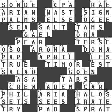 ACROSS 1. Something which is sent 6. Accounting whiz (abbr.) 9. Actress Charlotte 12. Believer in; advocate of (suffix) 13. Political cartoonist Thomas 14. Signal 15. Insides of hands 16. Otherwise 17. Double curve, resembling the letter S 18. Ocean 19. Table seasoning 20. Scottish caps 21. Highlander 23. Mouth or opening 24. Lightbulb-shaped fruit 25. Laconic 28. Bear (Spanish) 30. Odor 34. Capital of the state of Qatar 35. Infant food 36. Showery time 38. French article 39. Loyal 41. Southeast Indonesia island 43. Eastern Standard Time (abbr.) 44. First course 46. Travels 48. White ___ sheet 49. Bar bills 50. Ship's personnel 51. Arabian gulf 53. Auto 56. Silvers or Donahue 57. Roberta Peters solo 58. Radiant circles of light 60. Arranges properly for use 61. Observes 62. Feeling or showing extreme anger 63. Attempt to accomplish something 64. Groovy apt. 65. Small fatty European fish DOWN 1. Plant excrement 2. Mouths or openings 3. Mediterranean tributary 4. Break 5. Followers of ems 6. Give a ring to 7. Inconspicuous attention getter 8. Had dinner 9. Complicated, petty procedures 10. Eras 11. Compass dir. 13. Anneal 14. Flew 19. Spanish missionary in California 20. Small child 22. American Automobile Association (abbr.) 24. Teen's desire 26. "______ My Girl" (Turtles hit) 27. 90 degrees 28. Elects 29. "Two Mules for Sister ____" 31. Choose 32. Medical imaging device (abbr.) 33. Direct toward a target or goal 37. Utah city north of Ogden 40. Artist's stands 42. Director Reiner 45. Simpleton 47. Fortification 49. Afternoon social gatherings 50. "Mermaids" star 51. Type of rug 52. Passed on 54. Having or resembling wings 55. Round or rotation of duties 56. Pacific Standard Time (abbr.) 57. Viper 58. Part of HMS, perhaps 59. Put into a specified state