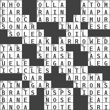 ACROSS 1. 17th letter of the Greek alphabet 4. Rounded earthenware pot or jar 8. Smallest unit of an element 12. Hearing organ 13. Precipitation 14. California wine valley 15. Coalition 17. "This won't hurt ____!" 18. Arboreal primate 19. Echolocation 21. _ tizzy (2 wds.) 23. Compass dir. 24. Having a sole or soles 26. Lubricate 28. Path through which fluid escapes 30. Moved like an arrow 34. Bar bill 37. Restaurants 39. Pull into pieces 40. According to 41. Gospel singer Marvin 43. White ___ sheet 44. Ubangi River tributary 46. Mild oath 47. Part of a journey 48. Winter's stalactites 51. International (abbr.) 54. Boat paddle 55. Odor 58. The 18th letter of the Arabic alphabet 61. Slender fish 63. Metal shackles 65. Naughty children 67. United States Postal Service (abbr.) 71. The content of cognition 72. Object of repulsion 73. Sense of smell 74. Ingest 75. Small Philippine buffalo 76. Carryall 77. Indian title of respect (Mr.) DOWN 1. Confederate soldiers (slang) 2. Radiant circles of light 3. U. of Maine site 4. Mouth or opening 5. Experiment locale 6. Cards in a Roman deck? 7. Against 8. A saturated hydrocarbon 9. Not wild 10. Musical composition 11. Female horse 16. Give a ring to 18. Den 20. To separate or throw off 22. And not 25. Raised platform 27. Car dealer's back yard 29. Leg joints 30. Slender Brazilian palm 31. Welt 32. Relaxation 33. To draw with force 34. "Change" in Tahitian 35. Actor Baldwin 36. Indonesian resort city 38. Tired old horse 42. Pulitzer Prize-winning author Ferber 45. Environmental prefix 49. Straggles 50. Epoch 52. Three (prefix) 53. Australian parrot (variant) 56. Methods 57. Approach 58. Swedish rock group 59. SW Asia republic 60. Billionth: prefix 62. The smallest animal of a litter 64. Suttee (variant) 66. Afternoon social gathering 68. "Barney Miller" actor Jack 69. Pacific Standard Time (abbr.) 70. Observe