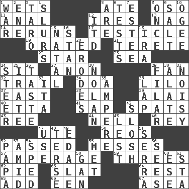 ACROSS 1. Soaks 5. Had dinner 8. Bear (Spanish) 11. Of or related to the anus 12. Angers 13. Tired old horse 14. Summer TV shows 17. One of the two male reproductive glands 19. Spoke pompously 21. Cylindrical with tapered ends 22. Play the lead 23. Ocean 24. Be seated 27. Soon (poet.) 29. Avid follower 32. Drop behind 34. ___ good deed 36. _ and Stitch 37. 90 degrees 38. Shade tree 39. Jai _ 40. Singer James 41. Plant excrement 42. Arguments over trivial matters 43. To riddle 44. 1994 drama film starring Jodie Foster 46. Marina Del _, California 47. Shoshoni 50. Vintage cars 52. Went by 55. Makes clutter 57. Electrical Measurement 59. Threesomes 62. Sliced dessert 63. Narrow board 64. Respite 65. Find the sum of 66. Car or cant ending 67. Toward the sea DOWN 1. Armed conflict 2. Compass dir. 3. Edible starchy tuberous root 4. Disparaging remarks 5. "We ___ not amused" (Victoria) 6. Trials 7. First name in cosmetics 8. At one time in the past 9. Table seasoning 10. Double curve, resembling the letter S 12. It would 15. Relating to or accompanying birth 16. Comedian Laurel of Laurel & Hardy 18. Lyricist Gershwin 20. Eats (away) 24. Bull 25. Feeling or showing extreme anger 26. Clothes sense 28. Pitcher Ryan 29. Having threads 30. Having winglike extensions 31. Annoyingly loud 33. Call ___ day 35. Electrical Unit 36. Pet locale 42. Agitate, as a liquid 45. For fear that 47. Purpose 48. Laconic 49. Peak District village in England 51. Father Junipero _ 52. Dad 53. Among 54. Hurried 55. Was introduced to 56. Perceives with the eye 58. Separate the seeds from cotton 60. Compass dir. 61. R.R. building