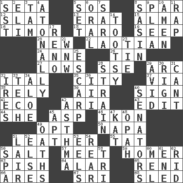 ACROSS 1. Bristle 5. Mayday 8. Coast Guard woman 12. Narrow board 13. Part of Q.E.F. 15. _ mater 16. Southeast Indonesia island 18. Edible starchy tuberous root 19. Ooze 20. ___ Haven, CT 22. Of or relating to Laos or its people 24. Queen of England 1702-14 26. Shallow baking pan 27. Coldest temperatures 28. Compass dir. 29. Curve 32. Slanted text style (abbr.) 35. Municipality 37. By way of 38. Trust 39. Atmosphere 40. Attach a signature 41. Environmental prefix 42. Operatic vocal solo 43. Prepare for publication 44. A female animal or person 45. Cleo's killer 46. Visual representation of an object 49. Choose 50. California wine valley 51. Cordwainer's material 55. Make lace 56. Table seasoning 57. Confront 59. Homing pigeon 63. Expression of disdain 64. Having or resembling wings 65. Painter Guido (1575-1642) 66. Ancient Greek god of war 67. _ Lanka 68. Downhill vehicle DOWN 1. Fast jet (abbr.) 2. Biblical high priest 3. Scottish cap 4. Lacking a tonal center or key 5. Arrange properly for use 6. Taken by mouth 7. "Two Mules for Sister ____" 8. Indian antelope 9. Entreaty 10. So be it 11. Strike 14. A girl or young woman (variant) 17. Former U.S. Attorney General Janet 21. Compass dir. 23. Neckwear 25. Fortification 28. Put through a sieve 29. Enthusiastic 30. Swiss mountan, "Queen of the Mountains" 31. Patter 32. Angers 33. Technician 34. Medicinal plant 36. One more than two 40. Legislators 42. Respiratory problem 45. Fitting 47. Krazy ___ of comics 48. Brightly colored fish 49. Curses 51. Den 52. Otherwise 53. Snakelike fish 54. Located in or toward the back 56. Health resort 58. Three (prefix) 60. Cartoonist voice _ Blanc 61. Compass dir. 62. To free from