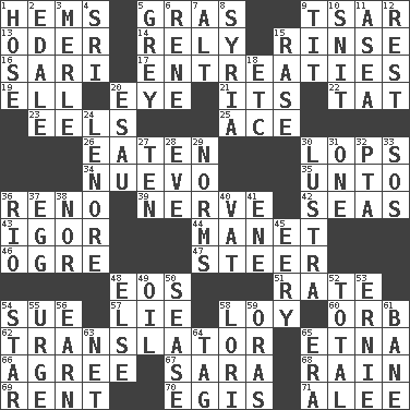 ACROSS 1. Folds over and sews together 5. Pate de foie ____ 9. Russian ruler of old 13. Baltic tributary 14. Have trust in 15. Wash lightly 16. Indian skirt 17. Pleas 19. Pipe bend 20. Sight organ 21. It is 22. Make lace 23. Snakelike fish 25. Adept person 26. Eroded 30. Chops off 34. New (sp.) 35. To (old English) 36. Western Nevada city 39. Impudent aggressiveness 42. Oceans 43. Composer Stravinsky 44. French painter Edouard 46. Legendary monster 47. Bull 48. Greek goddess of the dawn 51. Assign a rank or rating to 54. Take to court 57. Untruth 58. Myrna of the movies 60. Globe 62. Interpreter 65. Inactive volcano in Sicily 66. Match 67. "Two Mules for Sister ____" 68. Water falling in drops from the sky 69. Monthly bill 70. Armor plate that protects the chest 71. Toward shelter DOWN 1. Flexible conduit 2. Peak District village in England 3. Haggard of country music 4. Indian title of respect (Mr.) 5. Jennifer or Joel 6. French philosopher Descartes 7. Keyboard modifier key 8. Damascus' land 9. Teat (slang) 10. In a ____ (agitated or irritated) 11. Toward the sea 12. Relief 15. To erase 18. And so on (abbr.) 20. Son of Isaac 24. Poe poem 27. "___ Little Indians" 28. First lady 29. Typical standards 30. A period of five years 31. Single 32. Parent Teacher Assoc. 33. Mayday 36. River (Sp.) 37. Ovum 38. Not either 40. Large container 41. Compass dir. 45. Suggestive of the supernatural 48. Otherwise 49. Petroleum 50. Gospel singer Marvin 52. "_____ Recall" 53. Bert's buddy 54. Play the lead 55. Goad 56. Merit 58. Australian parrot (variant) 59. Mouths or openings 61. Object of repulsion 63. Fish or hair follower 64. Label 65. Epoch