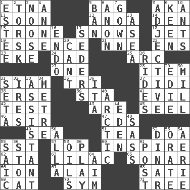 ACROSS 1. Inactive volcano in Sicily 5. Container for groceries 8. Alias (abbr.) 11. Within a short period 12. Small Philippine buffalo 14. Lair 15. Marketplace scale 17. Frozen precipitation (plural) 18. Type of plane 19. Center 21. Compass dir. 22. Followers of ems 23. Make supply last 24. June honoree 25. Curve 27. Single 28. A whole individual unit 31. Thailand, formerly 35. Three (prefix) 37. "You Light Up My Life" star Conn 38. Celtic language 39. R.R. building 41. Morally bad or wrong 42. Trial 43. "We ___ not amused" (Victoria) 45. Stitch closed the eyes of (a falcon) 46. SW Saudi Arabia district 47. Music discs 49. Ocean 51. Beverage made from leaves 52. ___ good deed 55. Fast jet (abbr.) 57. Chop off 60. Motivate 62. _ moment's notice (2 wds.) 63. Pale purple color 65. Underwater navigation system 66. Electrically charged atom 67. Jai _ 68. Suttee (variant) 69. Feline 70. Symbol (abbr.) 71. Woody plant DOWN 1. First name in cosmetics 2. Cod relative 3. Trap for birds or small mammals 4. Queen of England 1702-14 5. Forbid 6. Soon (poet.) 7. Bride's dress 8. Descriptive word 9. Peachy ____! 10. Pismires 13. At sea 16. Inside; within (prefix) 17. Spring feasts 20. Patter 26. Amusement-park features 29. Singer Brickell 30. Place where flour is made 31. Bristle 32. Angers 33. Aide 34. Distance measurement (Brit.) 36. Call ___ day 40. Northern region 44. Paradise 48. Backtalk 50. Silent film actress Nazimova 52. Middle Eastern gold or silver currency 53. Speak pompously 54. Nest on high 55. Ketch in the Levant 56. Portico 58. Petroleums 59. Romp 61. Mail 64. Direct toward a target or goal