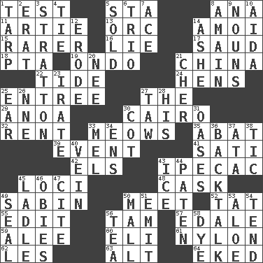 ACROSS 1. Trial 5. R.R. building 8. Santa ___, CA 11. Nick name for Arthur 13. The grampus (Milton) 14. Mine, in Marseilles 15. More uncommon 16. Whopper 17. Saudi Arabian king (1953-1964) 18. Parent Teacher Association (abbr.) 19. Southwest Nigerian state 21. Large country 22. Periodic rise and fall of the sea level 24. Coop moms 25. Main course 27. Definite Article 29. Small Philippine buffalo 30. Capital of Egypt 32. Monthly bill 33. Catcalls? 35. Blind as ____ 39. Incident 41. Suttee (variant) 42. Raised railways 43. Medicinal drug used to evoke vomiting 45. Locales 48. Keg 49. Unit of acoustic absorption 50. Rendezvous 52. Make lace 55. Prepare for publication 56. Scottish cap 57. Peak District village in England 59. Toward shelter 60. Connecticut Ivy Leaguer 61. Thermoplastic polyamide 62. French article 63. The first octave above the treble staff 64. Made supply last DOWN 1. Canvas cover 2. Part of Q.E.F. 3. Ski resort town in Vermont 4. Standoff 5. Disposed of to a purchaser 6. Musical group of three 7. Adept person 8. With great haste 9. Parts of speech 10. Opera by Verdi 12. Wear away 14. American tennis player Robert 20. Born 21. "Mermaids" star 23. Feeling or showing extreme anger 25. Ewer handle 26. Compass dir. 27. The 23rd letter of the Hebrew alphabet 28. Part of HMS, perhaps 30. Small bed 31. Fertile tracts in a desert 33. Cartoonist voice _ Blanc 34. Followers of ems 36. Sass 37. "One Day ___ Time" 38. Nervous spasm 40. Distinctive style or manner 43. Frozen water 44. Eucharist need 45. Dipping utensil 46. Off-Broadway awards 47. Quote 49. Lick closed 50. Promenade 51. Send forth 53. _ vera 54. Be inclined (to) 56. Beverage made from leaves 58. Color