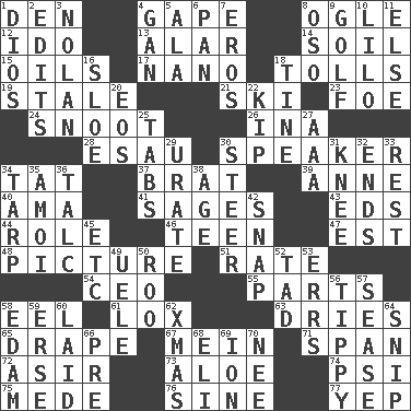 ACROSS 1. Lair 4. Yawn 8. Stare 12. Wedding promise 13. Having or resembling wings 14. The visible part of the earth's surface 15. Petroleums 17. Billionth: prefix 18. For Whom the Bell _____ 19. Lacking originality or spontaneity 21. What Jean-Claude Killy likes to do 23. Enemy 24. Snout, nose 26. _ tizzy (2 wds.) 28. He sold his birthright 30. Orator 34. Make lace 37. Naughty child 39. Queen of England 1702-14 40. Nursemaid (var.) 41. Gurus 43. Begley and Asner 44. Hero or heavy, e.g. 46. Adolescent 47. Eastern Standard Time (abbr.) 48. Photo 51. Pace 54. Corporate head (abbr.) 55. Pieces 58. Snakelike fish 61. Brine-cured salmon 63. Frees from moisture 65. Window treatment 67. Count _ (2 wds.) 71. Connect, as a bridge 72. SW Saudi Arabia district 73. Medicinal plant 74. Air pressure measure (abbr.) 75. Ancient Persian 76. Trig term 77. Slangy assent DOWN 1. "Vaya con ____" 2. Proofreads 3. Pitcher Ryan 4. Separate the seeds from cotton 5. Insect wing 6. Baking dish 7. Greek god of love 8. Bear (Spanish) 9. _ course 10. _ and Stitch 11. Otherwise 16. _ gin 18. Prong on a fork 20. Greek goddess of the dawn 22. Monetary unit of Laos 25. Bar bills 27. Auto club (abbr.) 29. A salt of uric acid 30. Navigate 31. Leg joint 32. Conclusions 33. State of inaction 34. Canvas cover 35. Mine, in Marseilles 36. Baby powder 38. Mature 42. Fastener 45. And so on (abbr.) 49. Ubangi River tributary 50. Friend of Pooh 52. Bit 53. Blunders 56. Likely to tip or tilt 57. Gospel singer Marvin 58. Dutch treat 59. Celtic language 60. Put down 62. Dec. holiday 64. Clip 66. Before (prefix) 68. Connecticut Ivy Leaguer 69. Electrically charged atom 70. Born