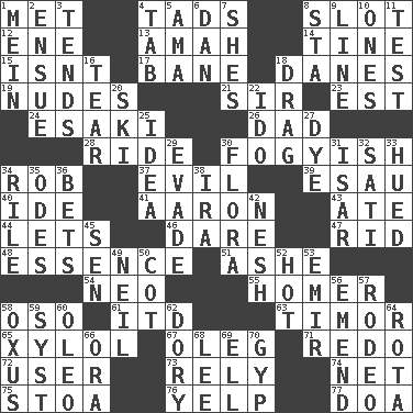 ACROSS 1. Was introduced to 4. Small boys 8. Narrow, elongated depression 12. Compass dir. 13. Nanny 14. Prong on a fork 15. Is not 17. Object of repulsion 18. Natives or inhabitants of Denmark 19. Unadorned figures 21. Title for a knight 23. Eastern Standard Time (abbr.) 24. 1973 Nobel Price Winner (Physics) Leo 26. June honoree 28. Travel on or in a vehicle 30. Out of fashion; old fashioned 34. Director Reiner 37. Tending to cause great harm 39. Son of Isaac 40. Binary compound 41. Composer Copland 43. Had dinner 44. Allows 46. Have the gumption 47. To free from 48. Gist 51. American tennis player Robert 54. Modern: prefix 55. Simpsons dad 58. Bear (Spanish) 61. It would 63. Southeast Indonesia island 65. Xylene (variant) 67. Cassini of fashion 71. Make new 72. One who uses or employs something 73. Trust 74. Fish or hair follower 75. Portico 76. Sharp bark 77. ___ good deed DOWN 1. Chow _ 2. Follow as a consequence or result 3. Watches over 4. Keyboard key 5. Nursemaid (var.) 6. One of the 12 tribes of Israel 7. "______ My Girl" (Turtles hit) 8. R.R. building 9. Actor's bit 10. Singles 11. Trial 16. Pull apart 18. To draw with force 20. What Jean-Claude Killy likes to do 22. Wedding promise 25. It may be bright or harebrained 27. Color 29. Dodge 30. Plants 31. Austrian river, tributary to the Danube 32. Suttee (variant) 33. Took on color 34. Cause heat under the collar 35. Lyric poems 36. Wagers 38. Retirement account (abbr.) 42. Soft 45. Elected rep. 49. Famous astronaut Armstrong 50. Small bed 52. Being at a high temperature 53. Arab leader 56. Make improvements or corrections to 57. Cowboy competition 58. The longest river in Central Asia 59. System (abbr.) 60. Margarine 62. Small, narrow, flatbottom fishing boat 64. Round or rotation of duties 66. Mouth or opening 68. Area sheltered from the wind 69. Pipe bend 70. Hustle