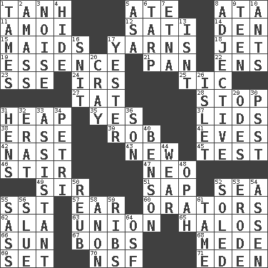 ACROSS 1. Hyperbolic tangent 5. Had dinner 8. "One Day ___ Time" 11. Mine, in Marseilles 12. Suttee (variant) 14. Lair 15. Unmarried girls 17. Entertaining tales 18. _ stream 19. Substance 21. Baking dish 22. Followers of ems 23. Compass dir. 24. Big collection agency 25. Nervous spasm 27. Make lace 28. Discontinue 31. Pile 35. It is so 37. Flaplike coverings 38. Celtic language 39. Director Reiner 41. Nights before holidays 42. Political cartoonist Thomas 43. ___ Haven, CT 45. Trial 46. Move through with a circular motion 47. Modern: prefix 49. Title for a knight 51. Plant excrement 52. Ocean 55. Fast jet (abbr.) 57. Ewer handle 60. Speakers 62. According to 63. The state of being joined or united 65. Radiant circles of light 66. Player for Phoenix 67. Moves up and down 68. Ancient Persian 69. Put into a specified state 70. Overdraft (abbr.) 71. Locale of original sin DOWN 1. Domesticates 2. Collect or gather 3. Annoying sound 4. Flintstone garb 5. White ___ sheet 6. Canvas cover 7. Inactive volcano in Sicily 8. Descriptive word 9. Adolescent 10. Pismires 13. Is not 16. In a ____ (agitated or irritated) 17. Of or pertaining to yesterday 20. Supercomputer manufacturer 26. Small island 29. Lyric poems 30. Inconspicuous attention getter 31. Coop moms 32. Part of Q.E.F. 33. Aide 34. _ dish (used to culture cells) 36. Male child 40. Gillaume's butler role 44. Put on (as clothing) 48. Brightly colored fish 50. Reuben's nickname 52. Having a sole or soles 53. Wear away 54. NE Netherlands city 55. Backtalk 56. Turn sharply 58. At once, immediately (arch.) 59. Teases 61. Docile 64. Order of Saint Francis (abbr.)