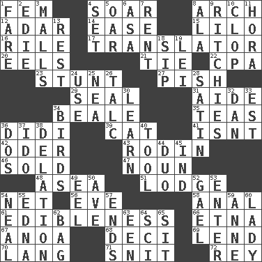 ACROSS 1. Opposite of masc. 4. Fly high 8. Bowlike part 12. The sixth month of the Jewish calendar 14. Relaxation 15. _ and Stitch 16. Cause heat under the collar 17. Interpreter 20. Snakelike fish 21. Standoff 22. Accounting whiz (abbr.) 23. Difficult or unusual or dangerous feat 27. Expression of disdain 29. Lick closed 31. Assistant 34. Memphis, Tenn. Street 35. Beverages made from leaves 36. "You Light Up My Life" star Conn 39. Feline 41. Is not 42. River in Europe 43. "The Thinker" sculptor 46. Disposed of to a purchaser 47. Part of speech 48. At sea 51. Cabin 54. Fish or hair follower 56. First lady 58. Of or related to the anus 61. The property of being fit to eat 66. Inactive volcano in Sicily 67. Small Philippine buffalo 68. Tenth: prefix 69. Grant temporary use of 70. Austrian-born American filmmaker Fritz 71. In a ____ (agitated or irritated) 72. Marina Del _, California DOWN 1. Conductor's collection 2. Singer Brickell 3. Promenades 4. Arrange properly for use 5. Rowing implement 6. White ___ sheet 7. Monthly bill 8. Chicken ___ king 9. Actors Guy, Robert Welles, and Clint 10. Hoof sound 11. Israeli folk dance 13. Repose 18. Small drink 19. Luau accessory 24. Purpose 25. Teachers' org. 26. Baby powder 28. Smooth fabric 30. Memorize 32. One of the 12 tribes of Israel 33. Eastern Standard Time (abbr.) 34. Avian creatures 36. Two (Sp.) 37. Wedding promise 38. Conveyance 40. Implement 44. Superhero pair 45. Indiana (abbr.) 49. Snakelike fish 50. "___ Maria" 52. Highlander 53. Keyboard key 54. Be tempered by heat 55. Pulitzer Prize-winning author Ferber 57. Conclusions 59. Singer Murray 60. Kenny Rogers chart-topper in '80 62. Container for groceries 63. Car or cant ending 64. _-fi 65. Be seated
