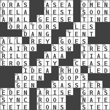 ACROSS 1. Mouths or openings 5. Toward the sea 9. Sign of something about to happen 13. Actor Lugosi 14. A home for chicks 15. Within a short period 16. Of or related to the anus 17. Honkers 18. Prong on a fork 19. Speakers 21. French article 22. Mild oath, euphamism for damn 23. Portable shelter 24. Everything 27. Marina Del _, California 28. Leaves 29. Capital of Egypt 31. Compass dir. 32. Angers 36. Cause heat under the collar 37. Auto club (abbr.) 38. Small bottle 39. Greek god of love 40. Filthy place 41. Desist 42. It may be bright or harebrained 44. 17th letter of the Greek alphabet 46. Directed 47. An important port of Yemen 48. I made a mistake 50. Commissioned mil. rank 51. More disrespectful 54. Locale of original sin 56. Originate 58. Pate de foie ____ 60. Synchronize (abbr.) 61. Carrot, for example 62. Nathan's nickname 63. Wig 64. Immeasurably long periods of time 65. Proofreading order DOWN 1. Chief or king in Benin or Nigeria 2. Former U.S. Attorney General Janet 3. Having or resembling wings 4. First course 5. Disorder of the immune system 6. Observes 7. Double-curved letter 8. Had dinner 9. Clearly or manifestly demonstrative 10. Wet 11. Period of immesurable duration 12. Compass dir. 17. Went 20. Edible starchy tuberous root 21. Area sheltered from the wind 23. Pull behind 24. 1/640 square mile 25. Den 26. _ and Stitch 28. Girls' org. (abbr.) 30. Dwelling 31. Declare 33. Monetary unit of Yemen 34. Comfort 35. Downhill vehicle 37. _ moment's notice (2 wds.) 40. Elected rep. 41. 911 reaches them 43. Lair 44. Exposes to great heat 45. Flexible conduit 47. Rep 49. Omens 51. The Jewish people; Israel 52. Part of Q.E.F. 53. Assign a rank or rating to 54. Eastern Standard Time (abbr.) 55. Color 56. "We ___ not amused" (Victoria) 57. Friend of Pooh 59. Arrange properly for use