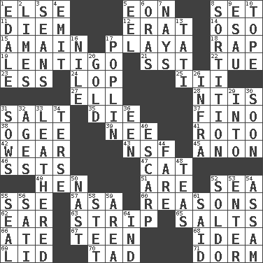 ACROSS 1. Otherwise 5. Period of immesurable duration 8. Arrange properly for use 11. South Vietnam president (1954) 12. Part of Q.E.F. 14. Bear (Spanish) 15. At full speed 17. Beach, in Buenos Aires 18. Reproach for some lapse or misdeed 19. Small, flat, pigmented spot on the skin 21. Fast jet (abbr.) 22. Third day of the wk. 23. Curvy letter 24. Chop off 25. One more than two 27. Pipe bend 28. Nuclear Threat Initiatives 31. Table seasoning 35. Pass on 37. Fine (Spanish) 38. Double curve, resembling the letter S 39. Born 41. Printing process, for short 42. Erode 43. Overdraft (abbr.) 45. At once, immediately (arch.) 46. Fast planes 47. Feline 49. Layer 51. "We ___ not amused" (Victoria) 52. Ocean 55. Compass dir. 57. White ___ sheet 60. Thinks logically 62. Ewer handle 63. Long narrow piece of something 65. Table seasonings 66. Had dinner 67. Adolescent 68. The main thing one is thinking about 69. Flaplike covering 70. Small amount or degree 71. Dormintory (informal) DOWN 1. Peak District village in England 2. Citrus fruits 3. Seines 4. Send forth 5. Snakelike fish 6. Mouths or openings 7. Negative votes 8. Conclusion 9. He sold his birthright 10. Drink excessively 13. Jacques of French films 16. The longest river in the world 17. Cotton for raincoats, e.g. 20. Gilt 26. Kind of red light 29. To the inside or interior of 30. Within a short period 31. Sty mamas 32. Grows older 33. Tough but pliablecoriaceous 34. Laconic 36. Car or cant ending 40. Fortification 44. Conductor's collection 48. Afternoon social gatherings 50. Political cartoonist Thomas 52. Twentieth part of a lira 53. Keyboard key 54. Indian state 55. Lick closed 56. Suttee (variant) 58. Proofreading order 59. Type of rug 61. Expressed in words 64. Working for oneself (abbr.)