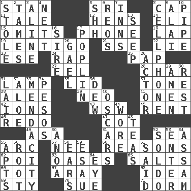 ACROSS 1. Comedian Laurel of Laurel & Hardy 5. _ Lanka 8. Head covering 11. Falsehood 12. Coop moms 14. Biblical high priest 15. Leaves out 17. Give a jingle 18. Infant locale 19. Small, flat, pigmented spot on the skin 21. Compass dir. 22. Whopper 23. Compass dir. 24. Hit sharply and swiftly 25. Infant food 27. Snakelike fish 28. Burn to charcoal 31. Desk light 35. Flaplike covering 37. Heavy book 38. Toward shelter 39. Modern: prefix 41. Washington bills 42. Charged particles 43. Compass dir. 45. Monthly bill 46. Make new 47. Small bed 49. White ___ sheet 51. "We ___ not amused" (Victoria) 52. Ocean 55. Curve 57. Born 60. Thinks logically 62. Luau course 63. Fertile tracts in a desert 65. Table seasonings 66. Small child 67. Like ___ of sunshine 68. It may be bright or harebrained 69. Filthy place 70. Institute legal proceedings 71. Dormintory (informal) DOWN 1. Fur scarf 2. Corrects by punishment or discipline 3. Place in a line 4. Remaining after all deductions 5. Quiet! 6. Vintage cars 7. Lodging establishments 8. Portable communications device 9. Mountain range southwest of Kyrgyzstan 10. Corncob 13. Ooze 16. Father 17. Cotton for raincoats, e.g. 20. Highlander 26. Thespian 29. So be it 30. Remainder 31. Den 32. Medicinal plant 33. Ananias' fault 34. Mexican monetary units 36. Morning condensation 40. Motion picture awards 44. Had on 48. Afternoon social gatherings 50. Small Philippine buffalo 52. Twentieth part of a lira 53. Keyboard key 54. Indian state 55. Tenement units (abbr.) 56. Carrot, for example 58. Hearing organs 59. Son of Isaac 61. Expressed in words 64. Sight organ