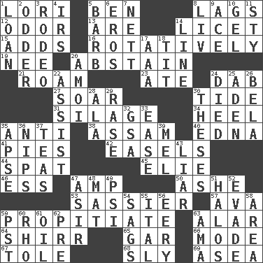 ACROSS 1. Australian parrot (variant) 5. Benjamin's nick name 8. Falls behind 12. Scent 13. "We ___ not amused" (Victoria) 14. It is permitted: Lat. 15. Sums up 16. Producing rotation 19. Born 20. Refrain by choice 21. Wander 23. Had dinner 24. Pat or tap gently 27. Fly high 30. Event that recurs at intervals 31. Fodder prepared in a silo 34. Person who is morally reprehensible 35. Against 38. Indian state 40. Pulitzer Prize-winning author Ferber 41. Sliced desserts 42. Artist's stands 44. Argument over a trivial matter 45. Writer Wiesel 46. Curvy letter 47. Electrical Unit 50. American tennis player Robert 53. More impudent 57. Actress Gardner 59. Conciliate 63. Having or resembling wings 64. Bake eggs in their shells 65. Slender fish 66. Method 67. Lacquered or enameled metalware 68. Wily 69. At sea DOWN 1. Grant temporary use of 2. More peculiar 3. Cowboy competition 4. Big collection agency 5. Sharp remark 6. Greek god of love 7. Remaining after all deductions 8. 54 in ancient Rome 9. Adept person 10. Set 11. Filthy place 14. Actor's bit 17. Auto club (abbr.) 18. Teat (slang) 20. Mine, in Marseilles 22. Aid 24. Passed on 25. An important port of Yemen 26. Actor Lugosi 28. In the manner of 29. Raze (variant) 30. College papers 32. Girls' org. (abbr.) 33. Relaxation 35. Domed church section 36. Pinches, bites 37. Beverages made from leaves 39. Cartoonist voice _ Blanc 43. One who doesn't tell the truth 47. SW Saudi Arabia district 48. Floor protector 49. Air pressure measure (abbr.) 51. Radiant circles of light 52. Elude 54. Settles 55. Slanted text style (abbr.) 56. Suggestive of the supernatural 58. Length times width 59. Pacific Standard Time (abbr.) 60. 17th letter of the Greek alphabet 61. Petroleum 62. Before (prefix) 63. Housemaid (var.)