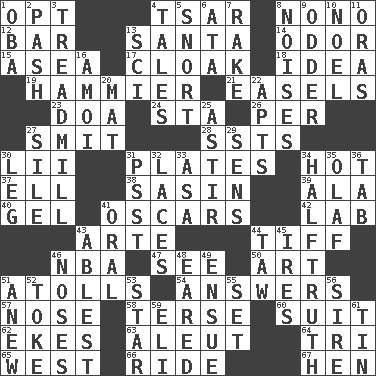 ACROSS 1. Choose 4. Russian ruler of old 8. Words to Nanette 12. Oblong piece of solid material 13. Before Barbara or Clara 14. Scent 15. Toward the sea 17. Loose outer garment 18. The content of cognition 19. More given to overacting 21. Artist's stands 23. ___ good deed 24. R.R. building 26. For each 27. Stricken, poetically 28. Fast planes 30. Cards in a Roman deck? 31. Food holders 34. Being at a high temperature 37. Pipe bend 38. Indian antelope 39. Insect wing 40. Set 41. Motion picture awards 42. Experiment locale 43. Johnson of "Laugh-In" 44. Small quarrel 46. Basketball assoc. 47. Observe 50. Nonscientific branch of learning 51. Ringlike coral islands and reefs 54. Replies 57. Characteristic smell of wine 58. Laconic 60. Set of matching outer garments 62. Supplements with great effort 63. Native American of Southwest Alaska 64. Three (prefix) 65. Compass direction 66. Travel on or in a vehicle 67. Layer DOWN 1. Chief or king in Benin or Nigeria 2. Romantic infatuation 3. Excercise machine 4. Falsehoods 5. Derisive sound 6. "One Day ___ Time" 7. Libertine 8. Annoying sounds 9. More peculiar 10. Christmas carol 11. Mouths or openings 13. _-fi 16. Mine, in Marseilles 20. Floor covering 22. Flats, for short 25. Moving or stirring 27. Drop; flow; fall 29. Elected reps. 30. Part of a journey 31. Inconspicuous attention getter 32. Shoestrings 33. White ___ sheet 34. Not exactly gospel 35. Norwegian king 36. Keyboard key 41. Spoken 43. Most capable 44. The 23rd letter of the Hebrew alphabet 45. Angers 46. Olfactory organs 48. Having ears or earlike features 49. Take place subsequently 51. Afresh 52. Casino tip 53. Play the lead 55. Put into a specified state 56. Father 59. Connecticut Ivy Leaguer 61. Shallow baking pan