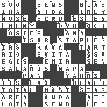 ACROSS 1. "Barney Miller" actor Jack 4. Elected reps. 8. Prejudice 12. Lyricist Gershwin 13. Portico 14. In an inward manner 15. Sense of smell 17. Shade of tan 18. _____ Park, CO 19. Foe 21. Movie disc 23. Sep. follower 24. Flexible twig of a willow tree 26. Santa ___, CA 28. Russian ruler of old 30. Paper fasteners 34. Big collection agency 37. Polynesian shrub of the pepper family 39. Small pie 40. _ de Janeiro 41. Webber/Rice musical 43. Girls' org. (abbr.) 44. Armor plate that protects the chest 46. Arab leader 47. Elected rep. 48. Deli grouping 51. California wine valley 54. Baking dish 55. Entertaining tales 58. It is 61. Not strict 63. Started a card game 65. Add up to 67. Vertical spar for supporting sails 71. Play the lead 72. Length times width 73. Small Philippine buffalo 74. Had dinner 75. Globular water bottle used in Asia 76. Post 77. Area sheltered from the wind DOWN 1. Trig term 2. U. of Maine site 3. Fertile tracts in a desert 4. Compass dir. 5. And so on (abbr.) 6. Or not 7. Saudi Arabian king (1953-1964) 8. Again 9. To the inside or interior of 10. Actor Baldwin 11. System (abbr.) 16. Send forth 18. Pulitzer Prize-winning author Ferber 20. It is so 22. Large container 25. Immoral or dissolute person 27. Fitting 29. All-night dance parties 30. Smooth fabric 31. Fails to keep up a pace 32. Celtic language 33. Comedian Laurel of Laurel & Hardy 34. Angers 35. Port city in Latvia 36. The visible part of the earth's surface 38. Zeal 42. Like ___ of sunshine 45. Plant excrement 49. Shopping center 50. _ tizzy (2 wds.) 52. Writing tablet 53. Ancient Greek god of war 56. Brizilian seaport 57. Schedule 58. Slanted text style (abbr.) 59. "Corrida" creature 60. Proofreading order 62. Dec. holiday 64. Woody plant 66. American Automobile Association (abbr.) 68. One (Scot) 69. Male child 70. Bit
