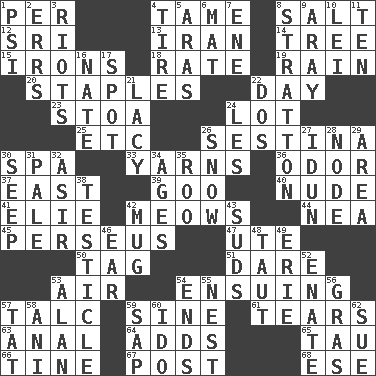 ACROSS 1. For each 4. Docile 8. Table seasoning 12. Indian title of respect (Mr.) 13. SW Asia republic 14. Relationship diagram 15. Removes the wrinkles 18. Pace 19. Precipitation 20. Paper fasteners 22. 24 hours 23. Portico 24. Car dealer's back yard 25. And so on (abbr.) 26. French poetic form 30. Health resort 33. Tall tales 36. Aroma 37. Compass direction 39. Thick or sticky substance 40. Unadorned 41. Writer Wiesel 42. Catcalls? 44. Teachers' org. 45. Son of Zeus who helped slay Medusa 47. Shoshoni 50. Label 51. Have the gumption 53. Atmosphere 54. Following as a consequence or result 57. Baby powder 59. Trig term 61. Pulls apart 63. Of or related to the anus 64. Does sums 65. The 19th letter of the Greek alphabet 66. Prong on a fork 67. Mail 68. Compass dir. DOWN 1. 23rd letter of the Greek alphabet 2. Blunders 3. Disturbances 4. Hoop that covers a wheel 5. Caspian sea tributary 6. Floor covering 7. Compass dir. 8. Ski resort town in Vermont 9. Like ___ of sunshine 10. Flowery wreath 11. Nine, plus one 16. Nathan's nickname 17. Blemish 21. Made of lace 22. Two (Sp.) 24. French article 26. Overwhelm 27. Goddess of spring and wife of Bragi 28. Thickened enlargement 29. Length times width 30. Ooze 31. Diluted with white 32. SW Saudi Arabia district 34. Ripens 35. Friend of Pooh 38. One of the two male reproductive glands 42. Large cup 43. Soap bubbles 46. Hearing organ 48. Strained 49. One of the Great Lakes 52. Related on the mother's side 53. Actor Alda or Thicke 54. Conclusions 55. A home for chicks 56. Pate de foie ____ 57. Make lace 58. Cuckoo 59. Plant excrement 60. Wedding promise 62. Take to court