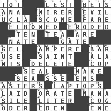 ACROSS 1. Small child 4. For fear that 8. Stakes 12. Santa ___, CA 13. One who wires 14. Tending to cause great harm 15. Southern CA. univ. 17. Biscuitlike quick bread 18. Conductor's collection 19. Turned at an angle; bent 21. Worn away 23. "___ Little Indians" 24. Afternoon social gathering 26. "We ___ not amused" (Victoria) 27. Nathan's nickname 28. Yard entry 30. Set 31. Electrical Unit 34. Drinking establishment 37. Purpose 38. Virtuous person 39. In the manner of 40. Mountains (abbr.) 41. Keyboard key 42. Police officer (slang) 43. Lick closed 44. Cause to be 46. Ocean 47. Compass dir. 50. Followers of ems 51. Michaelmas daisies 54. Portable computers 57. Put down 58. Declaim 60. Nanny 62. Filth; sediment 63. 61 cubic inches 64. Gear tooth 65. Baltic tributary 66. Locale of original sin 67. She-sheep DOWN 1. The 19th letter of the Greek alphabet 2. Single time 3. Baron Munchausen's specialties 4. It is permitted: Lat. 5. Eat (away) 6. Elected rep. 7. Woody plant 8. Prior to 9. Dodge 10. Hoop that covers a wheel 11. Downhill vehicle 13. Compass dir. 16. Collude with 20. Single 22. Pace 25. Representative 27. Egg locale 29. Johnson of "Laugh-In" 30. Chewing product 31. At sea 32. Shopping centers 33. Sliced dessert 34. Keyboard key 35. _ vera 36. Strike 41. Letter starter 43. Sowing specialist 44. Was introduced to 45. At once, immediately (arch.) 46. Vertical member of a panel or frame 48. Chalkboard 49. Ingested 51. In addition 52. Expressed in words 53. Not divided or shared with others 55. For each 56. Frozen precipitation 59. To free from 61. Personal question