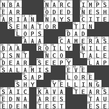 ACROSS 1. Basketball assoc. 4. Drug cop 8. Naughty children 12. Hearing organ 13. Wrote a lyric poem 14. Tender 15. Believer in; advocate of (suffix) 18. Negative votes 19. Quote 20. Elected representative 22. Shallow baking pan 23. Chops off 24. June honoree 25. Auto club (abbr.) 26. Devices for capturing images 30. Sound made by sheep 33. Agitated, as a liquid 36. "Death on the ____" 37. Is not 39. Non-commissioned officer (abbr.) 40. Lie 41. Letter starter 42. Oozy 44. Infant locale 45. Deli grouping 47. Night before a holiday 50. Plant excrement 51. Old wives' tales, e.g. 53. Like a shrinking violet 54. Crying or shouting loudly 57. Ketch in the Levant 59. Polynesian shrub of the pepper family 61. Rends 63. Pulitzer Prize-winning author Ferber 64. Ancient Greek god of war 65. The 19th letter of the Greek alphabet 66. Genesis locale 67. Trial 68. Compass dir. DOWN 1. Teachers' org. 2. Soap units 3. Satellite of Uranus 4. Words to Nanette 5. The sixth month of the Jewish calendar 6. Marina Del _, California 7. Music discs 8. Happening 9. Count _ (2 wds.) 10. Pacific Standard Time (abbr.) 11. A female animal or person 16. Small Philippine buffalo 17. California wine valley 21. Russian ruler of old 22. Scottish cap 24. 24 hours 26. Hoof sound 27. Monetary unit of Yemen 28. Silent film actress Nazimova 29. Ooze 30. Auction offers 31. Toward the sea 32. Of or related to the anus 34. Singles 35. Frozen water 38. File 13 42. Small drink 43. Shout 46. Can I? 48. Electrical Unit 49. 4th largest of the Great Lakes 52. Related on the mother's side 53. Trig term 54. Jacques Cousteau's middle name 55. 90 degrees 56. Pate de foie ____ 57. Perceive with the eye 58. Say or write further 59. Krazy ___ of comics 60. "We ___ not amused" (Victoria) 62. Take to court
