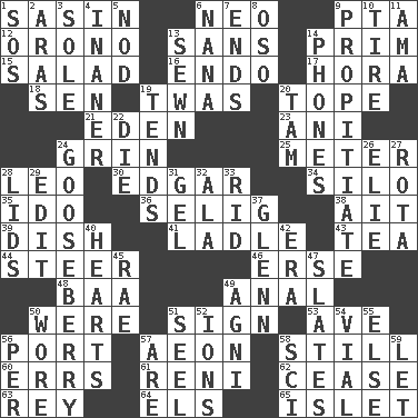 ACROSS 1. Indian antelope 6. Modern: prefix 9. Parent Teacher Assoc. 12. U. of Maine site 13. Without 14. Demure 15. Vegetable dish 16. Inside; within (prefix) 17. Israeli folk dance 18. Elected rep. 19. It was, poetically 20. Drink excessively 21. Genesis locale 23. Black tropical American cuckoo 24. Amused look 25. Distance measurement 28. Lion 30. _ Allan Poe 34. Grain storage tower 35. Wedding promise 36. Former Milwaukee Brewers owner Bud 38. Small island 39. Food container 41. Dipping utensil 43. Afternoon social gathering 44. Bull 46. Celtic language 48. Sound made by sheep 49. Of or related to the anus 50. Past tense of be (plural) 51. Public display of a written message 53. "___ Maria" 56. Left side of a ship or aircraft 57. Age 58. Not moving 60. Blunders 61. Painter Guido (1575-1642) 62. Stop 63. Marina Del _, California 64. Raised railways 65. Small island DOWN 1. Distress signal 2. Caspian sea tributary 3. Not divided or shared with others 4. More lacking in sense or substance 5. Allow head to fall sleepily 6. Grandmother 7. Conclusions 8. Bear (Spanish) 9. Conciliate 10. Hoop that covers a wheel 11. Nanny (var.) 13. Stitched 14. Gives a jingle 19. Watches over 20. Scottish cap 22. Expire 24. Sour, prickly fruit 26. Writer Wiesel 27. Round or rotation of duties 28. Flaplike coverings 29. Prepare for publication 31. Set 32. Insect wing 33. To free from 37. American astronaut and politician John 40. Centers 42. Period 45. Actress Charlotte 47. Chalkboards 49. Hindu god of fire 50. Had on 51. Stitch closed the eyes of (a falcon) 52. Charged particles 54. Small bottle 55. Otherwise 56. For each 57. "We ___ not amused" (Victoria) 58. _-fi 59. Allow