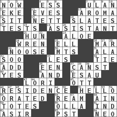 ACROSS 1. At this time 4. Curvy letter 7. ____ Bator 11. Supplement with great effort 12. Nights before holidays 13. Odor 14. Be seated 15. Remaining after all deductions 16. Chalkboards 17. Trials 19. Helper 21. Attila the _ 23. _ vera 24. Songbird 25. Pipe bend 26. Impair 29. Trap for birds or small mammals 30. Mountains (abbr.) 31. Insect wing 32. "Barney Miller" actor Jack 33. French article 34. Make a knot 35. Find the sum of 36. Car or cant ending 37. 2nd pers. sing. pres. of can (arch.) 40. It is so 41. Plus 42. Son of Isaac 43. Australian parrot (variant) 45. Baseball player Mel 46. Dwelling 51. Phone greeting 55. Spoke pompously 56. 480, 500 or 516 sheets of paper 58. The 18th letter of the Arabic alphabet 59. Hauls 60. Water jar 61. Indiana (abbr.) 62. SW Saudi Arabia district 63. Pacific Standard Time (abbr.) 64. Modern: prefix DOWN 1. Egg locale 2. Migrant worker of the '30s 3. Moistens 4. First lady 5. Bristle 6. Fast planes 7. A salt of uric acid 8. Globular water bottle used in Asia 9. So be it 10. Political cartoonist Thomas 12. Takes place subsequently 13. In addition 16. Beverly of Met fame 18. Through, poetically 20. Table seasonings 22. Compass dir. 24. Forest 25. Make improvements or corrections to 26. Taiwanese island in East China Sea 27. Set down 28. Actress Charlotte 29. Thickened enlargement 32. Declare 33. Soviet premier 1918-24 36. Having ears or earlike features 37. Corporate head (abbr.) 38. Respiratory problem 39. Nathan's nickname 43. 61 cubic inches 44. Lyric poems 46. Roll call or roster of names 47. Greek god of love 48. Suttee (variant) 49. Riding implement 50. Snakelike fish 52. (Had) reclined 53. Actor's bit 54. Southwest Nigerian state 57. Keyboard modifier key