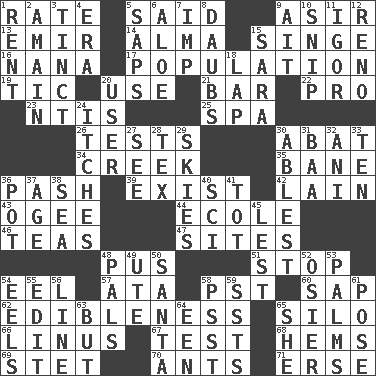 ACROSS 1. Pace 5. Alleged 9. SW Saudi Arabia district 13. Arab leader 14. _ mater 15. Scorch 16. Grandmother 17. Census information 19. Nervous spasm 20. Purpose 21. Tavern 22. Adept person 23. Nuclear Threat Initiatives 25. Health resort 26. Trials 30. Blind as ____ 34. Small stream 35. Object of repulsion 36. Romantic infatuation 39. Have an existence 42. (Had) reclined 43. Double curve, resembling the letter S 44. Learning spot: Fr. 46. Afternoon social gatherings 47. Locates 48. Fluid product of inflammation 51. Discontinue 54. Snakelike fish 57. "One Day ___ Time" 58. Pacific Standard Time (abbr.) 60. Plant excrement 62. The property of being fit to eat 65. Grain storage tower 66. "_ and Lucy" (Charlie Brown theme song) 67. Trial 68. Cloth borders 69. Proofreading order 70. Pismires 71. Celtic language DOWN 1. Monthly bill 2. At full speed 3. A color or tint 4. Epoch 5. Plant excrements 6. _ vera 7. Mischievous child 8. Applies to a surface 9. Small island 10. Sever or remove by pinching or nipping 11. Composer Stravinsky 12. Former U.S. Attorney General Janet 15. "Two Mules for Sister ____" 18. Pet locale 20. One who makes use of a thing 24. Strong, restless desires 27. Perceive with the eye 28. John Ritter's dad 29. Atmospheres 30. Most capable 31. Sound made by sheep 32. Cuckoo 33. Nine, plus one 36. Plant holder 37. Grow older 38. Ocean 40. _-fi 41. Small child 45. For fear that 48. Friends 49. Shoshoni 50. Before Barbara or Clara 52. Flexible twig of a willow tree 53. Insides of hands 54. Snakelike fish 55. Prepare for publication 56. Actor's bit 58. Inconspicuous attention getter 59. Fast planes 61. Introduce or present, as a question 63. With the exception that 64. Car or cant ending 65. A female animal or person