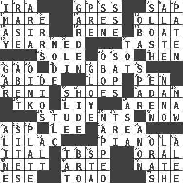 ACROSS 1. Retirement account (abbr.) 4. Global Positioning Systems (abbr.) 8. Plant excrement 11. Female horse 13. Ancient Greek god of war 14. Spanish pot 15. SW Saudi Arabia district 16. French philosopher Descartes 17. Water vessel 18. Felt deep pity or tenderness 21. Clothes sense 22. Not divided or shared with others 23. Bear (Spanish) 25. Layer 26. E Mali city 29. Empty-headed or silly people 32. Stay 34. Chop off 35. Animal enclosure 38. Painter Guido (1575-1642) 39. Imelda's hoard 41. First man 43. Ring climax 44. 54 in ancient Rome 45. Sports stadium 46. SAT takers 50. At this time 51. Viper 54. Area sheltered from the wind 55. Length times width 57. Pale purple color 59. Player piano 63. Slanted text style (abbr.) 64. Cook's measure (abbr.) 67. Taken by mouth 68. Remaining after all deductions 69. Johnson of "Laugh-In" 70. Nathan's nickname 71. Compass dir. 72. Frog relative 73. A female animal or person DOWN 1. "If ____ say so..." 2. Raze (variant) 3. Roberta Peters solo 4. Place where plants grow 5. Before (prefix) 6. Elected rep. 7. Compass dir. 8. Agitate, as a liquid 9. Having winglike extensions 10. Eucharist need 12. Blunders 14. Chief or king in Benin or Nigeria 19. Thickened enlargement 20. Connecticut Ivy Leaguer 21. Small child 23. Mitch Miller's instrument 24. Plant excrements 26. Slender fish 27. Collude with 28. Pig sound 30. Michael Jackson trademark 31. Practice fight 33. "Vaya con ____" 36. Locale of original sin 37. Billionth: prefix 39. Change direction abruptly 40. Flintstone garb 42. Opening into something insatiable 45. Toward the sea 47. Affectionate concern, for short 48. Slept 49. Three (prefix) 51. Place in a line 52. Settings 53. Food holder 56. At once, immediately (arch.) 58. The first octave above the treble staff 60. Mouths or openings 61. Thin strip of wood or metal 62. Toward shelter 64. Make lace 65. Sis' sibling 66. R.R. building