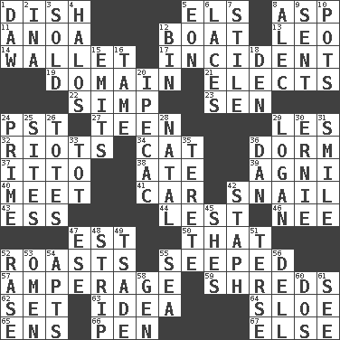 ACROSS 1. Food container 5. Raised railways 8. Viper 11. Small Philippine buffalo 12. Water vessel 13. Lion 14. Place for singles 17. Event 19. Kingdom 21. Chooses 22. Simple or foolish person 23. Elected rep. 24. Pacific Standard Time (abbr.) 27. Adolescent 29. French article 32. Disturbances 34. Feline 36. Dormintory (informal) 37. "Tell ____ the Marines!" 38. Had dinner 39. Hindu god of fire 40. Confront 41. Auto 42. Slow-paced one 43. Curvy letter 44. For fear that 46. Born 47. Eastern Standard Time (abbr.) 50. Not this but _ 52. Ridicules or criticizes harshly 55. Oozed 57. Electrical Measurement 59. Tears up 62. Put into a specified state 63. It may be bright or harebrained 64. A type of plum 65. Followers of ems 66. Writing instrument 67. Otherwise DOWN 1. Obsolete 2. _ tizzy (2 wds.) 3. Disposed of to a purchaser 4. Auras 5. Age 6. Shoestrings 7. Vertical member of a panel or frame 8. Actor Baldwin 9. Transmitted 10. Cooking vessels 12. Storage container 15. Gives off 16. Not wild 18. Lair 20. Medicinal drug used to evoke vomiting 24. A-one 25. Locates 26. Lugs 28. Relating to or accompanying birth 29. Utah city north of Ogden 30. Bert's buddy 31. Grin 33. Small child 35. Cigar-shaped 36. One of the 12 tribes of Israel 42. Staphylococcus 45. "______ My Girl" (Turtles hit) 47. Compass dir. 48. Remove all contents or possession from 49. Sadhe (variant) 51. Laconic 52. To erase 53. Sign of things to come 54. Flats, for short 55. Ocean 56. Small valley 58. Commissioned military rank (abbr.) 60. Two (Sp.) 61. Perceive with the eye