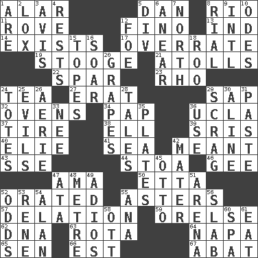 ACROSS 1. Having or resembling wings 5. Daniel's nick name 8. River (Sp.) 11. Be footloose 12. A pale, very dry sherry 13. Indiana (abbr.) 14. Is 17. Make much ado about nothing 19. Moe Howard, for one 21. Ringlike coral islands and reefs 22. Coast Guard woman 23. 17th letter of the Greek alphabet 24. Beverage made from leaves 27. Part of Q.E.F. 29. Plant excrement 32. Baking chambers 34. Infant food 36. Southern CA. univ. 37. Become fatigued 38. Pipe bend 39. Indian titles of respect 40. Writer Wiesel 41. Ocean 42. Intended 43. Compass dir. 44. Portico 46. Unit of force equal to gravity 47. Nanny (var.) 50. Singer James 52. Spoke pompously 55. Michaelmas daisies 57. Accusation by an informer 59. Threatening words 62. Heredity factor (abbr.) 63. Round or rotation of duties 64. California wine valley 65. Elected rep. 66. Eastern Standard Time (abbr.) 67. Blind as ____ DOWN 1. "We ___ not amused" (Victoria) 2. Brine-cured salmon 3. Advice 4. Musical pauses 5. HTML Container Element 6. Approach 7. _ pole 8. Monetary unit of Yemen 9. International (abbr.) 10. Lyric poems 12. Enemy 15. Drinks excessively 16. Fly high 18. Friend of Pooh 20. Raisin fruits 24. Lugs 25. Vices 26. Nest on high 28. Lies 29. Lean end of the neck 30. Place in a line 31. Thick mixture 33. Born 35. Food holders 36. Purpose 42. Mother 45. Von Bismarck 47. _ moment's notice (2 wds.) 48. Distance measurement (Brit.) 49. Goodbye (Sp.) 51. Sports stadium 52. Probability 53. French philosopher Descartes 54. Actor Alda or Thicke 55. Santa ___, CA 56. Broad, flat, thick piece 58. Baseball player Mel 60. Health resort 61. Consume