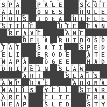 ACROSS 1. Health resort 4. Diluted with white 8. Highlander 12. Wind 13. Singles 14. Governing power 15. Plant holders 17. The main thing one is thinking about 18. Firearm 19. Vertical member of a panel or frame 21. Shoshoni 23. Avid follower 24. Rob, plunder, or pillage 26. A saturated hydrocarbon 28. Actor Lugosi 30. Noisy, rowdy, vocal (Spanish) 34. Make lace 37. Suttee (variant) 39. Hurried 40. Biblical high priest 41. Wear away 43. Had dinner 44. California wine valley 46. Double curve, resembling the letter S 47. Possessed 48. Popular '50s hangout 51. Cole _ (cabbage dish) 54. Nonscientific branch of learning 55. Narrow boards 58. Electrical Unit 61. Actress Charlotte 63. Scent 65. Shopping centers 67. Shout 71. Play the lead 72. Type of rug 73. Writer Wiesel 74. Period 75. Pile 76. Downhill vehicle 77. Filthy place DOWN 1. Plant excrements 2. Peter (Polish) 3. Nick name for Arthur 4. Luau course 5. Plus 6. Area sheltered from the wind 7. He sold his birthright 8. _ Lanka 9. _ links 10. Water jar 11. Adolescent 16. Thick slice 18. Painter Guido (1575-1642) 20. Night before a holiday 22. The 19th letter of the Greek alphabet 25. Otherwise 27. Begley and Asner 29. Composer Copland 30. Amusement-park features 31. Brightly colored fish 32. Stalk of a moss capsule 33. Wrote a lyric poem 34. Be inclined (to) 35. Having or resembling wings 36. Native american tent (variation) 38. Coat; cloak 42. Snakelike fish 45. Actress Gardner 49. Blunders 50. Call ___ day 52. Chicken ___ king 53. Armed conflicts 56. Lugs 57. Don Adams' spy role 58. Nursemaid 59. Female horse 60. Entreaty 62. Snake ____ (dice throw) 64. Like ___ of sunshine 66. Pet locale 68. Pipe bend 69. Whopper 70. Directed