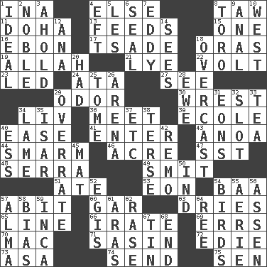 ACROSS 1. _ tizzy (2 wds.) 4. Otherwise 8. The 23rd letter of the Hebrew alphabet 11. Capital of the state of Qatar 13. Eats 15. Single 16. Inky black, to poets 17. Sadhe (variant) 18. Mouths or openings 19. Assad's deity 21. Potassium hydroxide 22. Electrical Unit 23. Directed 24. "One Day ___ Time" 27. Perceive with the eye 29. Aroma 30. Take or capture by force 34. 54 in ancient Rome 36. Confront 39. Learning spot: Fr. 40. Comfort 41. Keyboard key 43. Small Philippine buffalo 44. Excessive but superficial compliments 46. 1/640 square mile 47. Fast jet (abbr.) 48. Father Junipero _ 49. Stricken, poetically 51. Had dinner 53. Age 54. Sound made by sheep 57. "This won't hurt ____!" 60. Slender fish 63. Frees from moisture 65. Actor's bit 66. Feeling or showing extreme anger 69. Blunders 70. Apple computer (short form) 71. Indian antelope 72. Singer Brickell 73. White ___ sheet 74. Post 75. Elected rep. DOWN 1. Standard of perfection 2. Impressive in appearance 3. Hold, grip (Informal) 4. Lizard (obsolete) 5. French article 6. Lick closed 7. Whirlpool 8. "Corrida" creature 9. Of or related to the anus 10. 270 degrees 12. Santa ___, CA 14. Observes 18. Cloudy 20. Possessed 25. Heavy book 26. Sports stadium 28. She-sheep 29. Make much ado about nothing 31. Immeasurably long periods of time 32. Position in a hierarchy or organization 33. Afternoon social gathering 34. Unable to walk 35. Austrian river, tributary to the Danube 37. And so on (abbr.) 38. Laconic 40. Double-curved letter 42. San ____ (Riviera town) 45. Floor protector 50. Working for oneself (abbr.) 52. The front part of a cuirass 54. Avian creatures 55. Nest on high 56. NE Netherlands city 57. _ mater 58. Prejudice 59. South American Indian 61. Ancient river in northeast Turkey 62. To erase 64. Portuguese money of account (variant) 67. Shallow baking pan 68. Conclusion