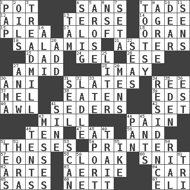 ACROSS 1. Plant holder 4. Without 8. Small amounts or degrees 12. Atmosphere 13. Laconic 14. Double curve, resembling the letter S 15. Entreaty 17. Upward 18. NW Algerian seaport 19. Deli grouping 21. Michaelmas daisies 23. Male parent 24. Set 26. Compass dir. 27. Among 28. "If ____ say so..." 30. Cuckoo 31. Chalkboards 34. Portuguese money of account (variant) 37. Cartoonist voice _ Blanc 38. Consumed 39. Begley and Asner 40. Leather borer 41. Spring feasts 42. Arrange properly for use 43. Place where flour is made 44. Ache 46. "___ Little Indians" 47. Consume 50. Plus 51. College papers 54. Hard copy producer 57. Immeasurably long periods of time 58. Hide under a false appearance 60. In a ____ (agitated or irritated) 62. Johnson of "Laugh-In" 63. Nest on high 64. Automobile 65. Backtalk 66. Remaining after all deductions 67. Connecticut Ivy Leaguer DOWN 1. Infant food 2. Petroleums 3. Excercise machine 4. Former Milwaukee Brewers owner Bud 5. Came up 6. Overdraft (abbr.) 7. Bristle 8. Tootsie (variant) 9. Match 10. Letter starter 11. Elected reps. 13. Scottish cap 16. Jai ____ 20. Say or write further 22. Oceans 25. 61 cubic inches 27. Afresh 29. Not women's 30. Nanny (var.) 31. Sew up the eyelids of hawks and falcons 32. Dipping utensil 33. Had dinner 34. Home 35. Genesis locale 36. Eastern Standard Time (abbr.) 41. Trig term 43. Makes clutter 44. Baking dish 45. Pismires 46. Portable shelters 48. To the left, to Queeg 49. Distinguishing feature 51. Beverages made from leaves 52. Israeli folk dance 53. Examine hastily 55. Mamie's mate 56. Monetary unit of Yemen 59. Area sheltered from the wind 61. Three (prefix)