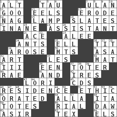 ACROSS 1. Keyboard modifier key 4. The 19th letter of the Greek alphabet 7. ____ Bator 11. Thick or sticky substance 12. Snakelike fish 13. Eat (away) 14. Tired old horse 15. Desk light 16. Chalkboards 17. Empty; void 19. Helper 21. Adept person 23. Toward shelter 24. Pismires 25. Pipe bend 26. Teat (slang) 29. Came up 30. Mountains (abbr.) 31. White ___ sheet 32. Nonscientific branch of learning 33. French article 34. Floor covering 35. One more than two 36. Car or cant ending 37. Carrier 40. Actress Charlotte 41. Added to 42. Angers 43. Australian parrot (variant) 45. Music discs 46. Home 51. Moral principle 55. Spoke pompously 56. Silent film actress Nazimova 58. Call ___ day 59. Lugs 60. Monetary unit of Yemen 61. Simpleton 62. SW Saudi Arabia district 63. John Ritter's dad 64. Raised railways DOWN 1. Hindu god of fire 2. Grant temporary use of 3. Ancient Roman robe 4. Afternoon social gathering 5. _ mater 6. United States Postal Service (abbr.) 7. A salt of uric acid 8. Globular water bottle used in Asia 9. Arabian gulf 10. A home for chicks 12. Opts 13. Otherwise 16. Beverly of Met fame 18. Billionth: prefix 20. Table seasonings 22. Compass dir. 24. Nick name for Arthur 25. Make improvements or corrections to 26. Corrects by punishment or discipline 27. Austrian river, tributary to the Danube 28. Make lace 29. Operatic vocal solo 32. Wind 33. Soviet premier 1918-24 36. Having ears or earlike features 37. Nervous spasm 38. Severe or trying experience 39. Trial 43. 61 cubic inches 44. Lyric poems 46. Roll call or roster of names 47. Greek god of love 48. Suttee (variant) 49. Heavy open wagon 50. Writer Wiesel 52. Flintstone garb 53. Slanted text style (abbr.) 54. Crow sounds 57. Not strict