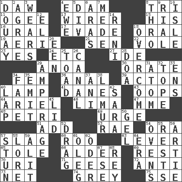 ACROSS 1. Simpleton 4. Dutch treat 8. Three (prefix) 11. Double curve, resembling the letter S 13. One who wires 15. Part of HMS, perhaps 16. Mountain range 17. Dodge 18. Taken by mouth 19. Nest on high 21. Elected rep. 22. Grand slam 23. Consenting reply 24. And so on (abbr.) 27. Binary compound 29. Small Philippine buffalo 30. Speak pompously 34. Opposite of masc. 36. Of or related to the anus 39. NE Massachussets city 40. Desk light 41. Natives or inhabitants of Denmark 43. I made a mistake 44. Satellite of Uranus 46. Pale green bean 47. Madame (abbr.) 48. _ dish (used to culture cells) 49. Goad 51. Say or write further 53. Actress Charlotte 54. Mouth or opening 57. Volcanic refuse 60. Friend of Pooh 63. Prying instrument 65. Lacquered or enameled metalware 66. Tree or shrub in the Birch family 69. Repose 70. RI univ. 71. Honkers 72. Opposed to 73. Fish or hair follower 74. Jennifer or Joel 75. Compass dir. DOWN 1. A city in N France, SE of Calais 2. Match 3. Erodes 4. She-sheep 5. HTML Container Element 6. Caspian sea tributary 7. Ancient Persian 8. Through, poetically 9. Monetary unit of Yemen 10. Small island 12. Connecticut Ivy Leaguer 14. Painter Guido (1575-1642) 18. Conquer 20. Car or cant ending 25. Frog relative 26. Lessep's creation 28. ___ good deed 29. Electrical Measurement 31. Tiny particle 32. Drink excessively 33. Followers of ems 34. Conductor's collection 35. Send forth 37. Cuckoo 38. Arboreal primate 40. Pet locale 42. "Two Mules for Sister ____" 45. Flaplike covering 50. Set 52. To trail on the ground 54. Baking chambers 55. Musical pauses 56. Nick name for Arthur 57. Astound 58. Old wives' tales, e.g. 59. Set down 61. Cassini of fashion 62. River in Europe 64. Epoch 67. Compass dir. 68. Marina Del _, California