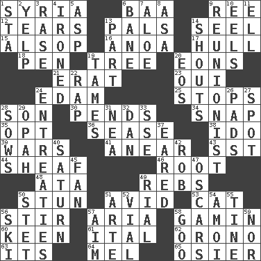 ACROSS 1. Damascus' land 6. Sound made by sheep 9. To riddle 12. Rends 13. Friends 14. Sew up the eyelids of hawks and falcons 15. Columnist Joseph or Stewart 16. Small Philippine buffalo 17. Frame or body of a ship 18. Animal enclosure 19. Woody plant 20. Immeasurably long periods of time 21. Part of Q.E.F. 23. Fr. "Yes" 24. Dutch treat 25. Closes up, plugs up 28. Male child 30. Hangs 34. Fastener 35. Choose 36. Gospel singer Marvin 38. Wedding promise 39. Armed conflicts 41. Approach 43. Fast jet (abbr.) 44. To gather and bind into a bundle 46. Carrot, for example 48. _ moment's notice (2 wds.) 49. Confederate soldiers (slang) 50. Make senseless or dizzy 51. Enthusiastic 53. Feline 56. Disorderly outburst 57. Operatic vocal solo 58. Street urchin 60. Peachy ____! 61. Slanted text style (abbr.) 62. U. of Maine site 63. ___ a Wonderful Life 64. Cartoonist voice _ Blanc 65. Flexible twig of a willow tree DOWN 1. R.R. building 2. Sharp bark 3. To erase 4. Pressed 5. Cleo's killer 6. Object of repulsion 7. Medicinal plant 8. White ___ sheet 9. One who advocates reunion 10. Snakelike fish 11. Pipe bend 13. Role in a play 14. Yells 19. Corrects by punishment or discipline 20. Greek goddess of the dawn 22. Strike 24. Pleas 26. Groovy apts. 27. Specific locale 28. Sty mamas 29. Brightly colored fish 31. Teachers' org. 32. One of the 12 tribes of Israel 33. Compass dir. 37. Having ears or earlike features 40. Titan orbits this 42. Director Reiner 45. Air blower 47. Motion picture awards 49. Monetary unit of Yemen 50. Proofreading order 51. Johnson of "Laugh-In" 52. Small bottle 54. Mine, in Marseilles 55. Prong on a fork 56. What Jean-Claude Killy likes to do 57. Direct toward a target or goal 58. Thick or sticky substance 59. Or not