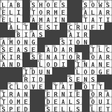 ACROSS 1. Experiment locale 4. Imelda's hoard 9. Sty mamas 13. Connecticut Ivy Leaguer 14. Singer Mel 15. Having or resembling wings 16. Pipe bend 17. With great haste 18. Jacques of French films 19. Keyboard modifier key 21. Eastern Standard Time (abbr.) 22. An unpleasant substance 24. Prejudice 26. Wind 27. Amid 29. The Jewish people; Israel 30. Gospel singer Marvin 31. The sixth month of the Jewish calendar 33. Affectionate concern, for short 36. Apertif with cassis 37. Legislator 40. Rowing implement 41. Added to 42. Farming town in central California 43. Lacking in sense or substance 45. Goddess of spring and wife of Bragi 47. Cabin 48. To free from 49. Elected reps. 50. Garlic unit 52. Make lace 54. Baseball player Mel 56. SW Asia republic 57. Bert's buddy 59. Mouth or opening 61. Heavy book 62. Allots cards 63. Fr. "Yes" 64. Hurried 65. Exchanges for money 66. Allow DOWN 1. Area sheltered from the wind 2. Silent film actress Nazimova 3. Big road sign 4. R.R. building 5. Dwellings 6. Mouths or openings 7. Send forth 8. Elected rep. 9. Titan orbits this 10. Norwegian king 11. Electrical Unit 12. Indian title of respect (Mr.) 20. Metal containers 22. Capital of Egypt 23. _ de Janeiro 25. Grows older 27. "____ silly question..." 28. Count _ (2 wds.) 29. Suttee (variant) 31. Soon (poet.) 32. Male parent 33. Inedible or poisonous agaric 34. Austrian-born American filmmaker Fritz 35. Algonquian 38. Evade 39. Cause heat under the collar 44. Words to Nanette 45. Pressed 46. HTML Container Element 49. Free of sound 50. Riding implement 51. Unable to walk 52. Relationship diagram 53. Of or related to the anus 55. Loyal 56. It is 57. Begley and Asner 58. Double-curved letter 60. Small island
