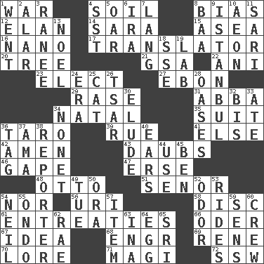 ACROSS 1. Armed conflict 4. Land 8. Prejudice 12. Style 14. "Two Mules for Sister ____" 15. Toward the sea 16. Billionth: prefix 17. Interpreter 20. Family _ (genealogy) 21. Girls' org. (abbr.) 22. Cuckoo 23. Voters do this 27. Inky black, to poets 29. Raze (variant) 31. Swedish rock group 34. Brizilian seaport 35. Costume for a special activity 36. Edible starchy tuberous root 39. Regret 41. Otherwise 42. So be it 43. Applies to a surface 46. Open wide 47. Celtic language 48. Von Bismarck 51. Sir (Sp.) 54. Or not 56. RI univ. 58. Compact _ 61. Pleas 66. Baltic tributary 67. The main thing one is thinking about 68. Engineer (abbr.) 69. French philosopher Descartes 70. Old wives' tales, e.g. 71. Wise men 72. Compass dir. DOWN 1. Gone 2. Having or resembling wings 3. Indian princess (variant) 4. Fast jet (abbr.) 5. Boat paddle 6. Retirement account (abbr.) 7. Austrian-born American filmmaker Fritz 8. Sound made by sheep 9. Byzantium, centuries later 10. Period of immesurable duration 11. Indian skirt 13. Christmas carol 18. Compass dir. 19. Experiment locale 24. Epoch 25. Domesticated feline 26. Russian ruler of old 28. Fertile tracts in a desert 30. Dodge 32. Altar cloth linen 33. Had dinner 34. Music written for nine 36. Label 37. Housemaid (var.) 38. News announcer 40. Hearing organs 44. Purpose 45. Benjamin's nick name 49. Third day of the wk. 50. Mouth or opening 52. Aroma 53. Amusement-park features 54. Famous astronaut Armstrong 55. Southwest Nigerian state 57. A distinct part 59. Elected reps. 60. Group working together 62. Actress Charlotte 63. _ tizzy (2 wds.) 64. Ovum 65. Indian title of respect (Mr.)