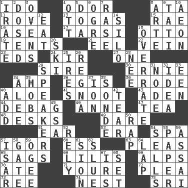 ACROSS 1. Wedding promise 4. Scent 8. "One Day ___ Time" 11. Be footloose 13. Ancient Roman robes 15. Actress Charlotte 16. Toward the sea 17. Tarsus (plural) 18. Von Bismarck 19. Portable shelters 21. Snakelike fish 22. Distinctive style or manner 23. Begley and Asner 24. Apertif with cassis 27. Single 29. Father 30. Bert's buddy 34. Electrical Unit 36. The front part of a cuirass 39. Eat (away) 40. _ vera 41. Snout, nose 43. An important port of Yemen 44. Debunk (Brit. slang) 46. Singer Murray 47. Afternoon social gathering 48. Writing tables 49. Have the gumption 51. Hearing organ 53. Period 54. Health resort 57. Russian composer Stravinsky 60. Double-curved letter 63. Entreaties 65. Droops 66. Ms. Damita and namesakes 69. High mountains 70. Had dinner 71. You are 72. Entreaty 73. To sift 74. Egg locale 75. _ Lanka DOWN 1. Feeling or showing extreme anger 2. Administered medicine 3. Baking chambers 4. Baseball player Mel 5. ___ good deed 6. Legendary monster 7. Raze (variant) 8. Johnson of "Laugh-In" 9. Jacques of French films 10. Age 12. Consume 14. Grain storage tower 18. Make much ado about nothing 20. What Jean-Claude Killy likes to do 25. Angers 26. Canadian anthropologist Darnell 28. Born 29. Orators 31. Connecting point 32. It may be bright or harebrained 33. Car or cant ending 34. Toward shelter 35. Disorderly crowds 37. Electrically charged atom 38. Something which is sent 40. Say or write further 42. Lacerate 45. Girls' org. (abbr.) 50. Hit sharply and swiftly 52. Have trust in 54. Exchanges for money 55. Some stationery 56. Slender Brazilian palm 57. Austrian river, tributary to the Danube 58. Yard entry 59. Double curve, resembling the letter S 61. The Jewish people; Israel 62. Turn sharply 64. Pet locale 67. Big collection agency 68. Arrange properly for use
