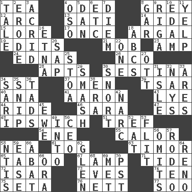 ACROSS 1. Beverage made from leaves 4. Wrote a lyric poem 8. Jennifer or Joel 12. Curve 13. Suttee (variant) 14. Assistant 15. Old wives' tales, e.g. 17. Single time 18. Therefore, facetiously 19. Proofreads 21. Crowd into 23. Electrical Unit 24. Ferber et al. 26. Non-commissioned officer (abbr.) 28. Tenement units (abbr.) 30. French poetic form 34. Fast jet (abbr.) 37. Sign of something about to happen 39. Russian ruler of old 40. Santa ___, CA 41. Composer Copland 43. Sodium hydroxide 44. Travel on an animal 46. "Two Mules for Sister ____" 47. Curvy letter 48. NE Massachusetts town 51. Not kosher 54. Compass dir. 55. Bodily heat indicating an inflammation 58. Teachers' org. 61. Coat; cloak 63. The easternmost of the Lesser Sundas 65. Off limits 67. Desk light 71. Periodic rise and fall of the sea level 72. Austrian river, tributary to the Danube 73. Nights before holidays 74. Nine, plus one 75. Stalk of a moss capsule 76. Remaining after all deductions 77. "Barney Miller" actor Jack DOWN 1. Story 2. Eat (away) 3. Bitter 4. Bear (Spanish) 5. One of the 12 tribes of Israel 6. And so on (abbr.) 7. South Vietnam president (1954) 8. Slender fish 9. Capital of Latvia 10. Dutch treat 11. Sharp bark 16. Inactive volcano in Sicily 18. Lettered men learn these first 20. Plant excrement 22. Single 25. Portico 27. Baseball player Mel 29. Box-office sellout 30. Derisive sound 31. Small island 32. Negative votes 33. Ancient Greek god of war 34. Indian skirt 35. Sever or remove by pinching or nipping 36. Small boys 38. Epoch 42. Drug cop 45. She-sheep 49. To the inside or interior of 50. Corporate head (abbr.) 52. Erode 53. Secret move to avoid paying debts 56. Leaves out 57. Cowboy competition 58. Nuclear Threat Initiatives 59. Comfort 60. Blind as ____ 62. Small, secluded valley 64. Former U.S. Attorney General Janet 66. Mouth or opening 68. "___ Maria" 69. Was introduced to 70. Pacific Standard Time (abbr.)