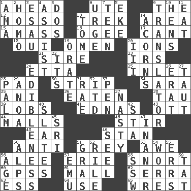 ACROSS 1. Forward in time 6. Shoshoni 9. Definite Article 12. With motion or animation 13. Long journey 14. Type of rug 15. Collect or gather 16. Double curve, resembling the letter S 17. Patter 18. Fr. "Yes" 19. Presage 20. Charged atoms 21. Beget 23. Big collection agency 24. Singer James 25. An arm off of a larger body of water 28. Writing tablet 30. Long narrow piece of something 34. "Two Mules for Sister ____" 35. Cuckoo 36. Eroded 38. The 19th letter of the Greek alphabet 39. Tennis shots 41. Ferber et al. 43. Baseball player Mel 44. Shopping centers 46. Tumult 48. Ewer handle 49. Comedian Laurel of Laurel & Hardy 50. Against 51. Jennifer or Joel 53. Deep reverence 56. Toward shelter 57. One of the Great Lakes 58. Derisive sound 60. Global Positioning Systems (abbr.) 61. Shopping center 62. Spanish missionary in California 63. Curvy letter 64. Purpose 65. Obtain by seizing forcibly or violently DOWN 1. Nanny (var.) 2. Same (prefix) 3. He sold his birthright 4. Help 5. Two (Sp.) 6. Goad 7. Adolescent 8. Supplement with great effort 9. Interpreter 10. Coop moms 11. Ingest 13. Heavy book 14. Oak nuts 19. Speak pompously 20. One more than two 22. ___ a Wonderful Life 24. The property of being fit to eat 26. Part of Q.E.F. 27. Pulled tight 28. Inside of hand 29. Small Philippine buffalo 31. Actress Charlotte 32. It would 33. Animal enclosure 37. Difficult 40. Chalkboards 42. R.R. building 45. _ Lanka 47. More empty; more void 49. Sew up the eyelids of hawks and falcons 50. High mountains 51. Pate de foie ____ 52. Cause heat under the collar 54. Had on 55. Blunders 56. Ripen 57. Australian flightless bird 58. Compass dir. 59. Make lace