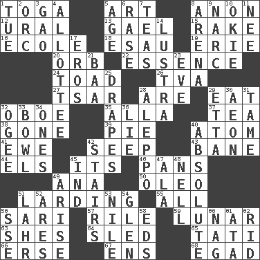 ACROSS 1. Ancient Roman robe 5. Tate display 8. Soon (poet.) 12. Mountain range 13. Highlander 15. Immoral or dissolute person 16. Learning spot: Fr. 18. Son of Isaac 19. 4th largest of the Great Lakes 20. Globe 22. Core 24. Frog relative 26. Federal power corp. 27. Russian ruler of old 28. "We ___ not amused" (Victoria) 29. Erode 32. Mitch Miller's instrument 35. Silent film actress Nazimova 37. Beverage made from leaves 38. Went 39. Sliced dessert 40. Tiny particle 41. She-sheep 42. Ooze 43. Object of repulsion 44. Raised railways 45. ___ a Wonderful Life 46. Baking dishes 49. Santa ___, CA 50. Butter sub 51. Preparing or cooking with lard 55. Everything 56. Indian skirt 57. Cause heat under the collar 59. Type of eclipse 63. "______ My Girl" (Turtles hit) 64. Downhill vehicle 65. Jacques of French films 66. Celtic language 67. Followers of ems 68. Mild oath DOWN 1. Third day of the wk. 2. The grampus (Milton) 3. E Mali city 4. One to whom something is allotted 5. Ripen 6. Raze (variant) 7. Beverages made from leaves 8. Sports stadium 9. Drug cop 10. Migrant worker of the '30s 11. Born 14. A period of five years 17. Greek god of love 21. Sound made by sheep 23. First lady 25. Window treatments 28. City in Syria 29. Singer James 30. Period of immesurable duration 31. Not wild 32. Double curve, resembling the letter S 33. Soup holder 34. Singles 36. Whopper 40. Utter; complete 42. Flight of steps 45. Working for oneself (abbr.) 47. Insect wing 48. 1994 drama film starring Jodie Foster 49. Get up 51. Cowardly lion portrayer 52. Ancient Greek god of war 53. "Death on the ____" 54. Small, secluded valley 56. Compass dir. 58. Begley and Asner 60. Tired old horse 61. "One Day ___ Time" 62. To free from