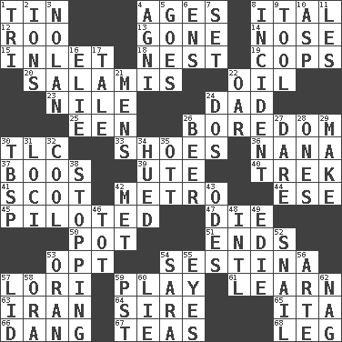 ACROSS 1. Shallow baking pan 4. Eons 8. Slanted text style (abbr.) 12. Friend of Pooh 13. Went 14. Olfactory organ 15. An arm off of a larger body of water 18. Egg locale 19. 911 reaches them 20. Deli grouping 22. Petroleum 23. Mediterranean tributary 24. Male parent 25. Car or cant ending 26. Mood resulting from idleness 30. Affectionate concern, for short 33. Imelda's hoard 36. Nanny 37. Expressions of contempt or scorn 39. Shoshoni 40. Long journey 41. Highlander 42. Paris' subway 44. Compass dir. 45. Manned the helm 47. Expire 50. Plant holder 51. Conclusions 53. Elect 54. French poetic form 57. Australian parrot (variant) 59. Live dramatic performance 61. Memorize 63. SW Asia republic 64. Title for a man of rank and authority 65. Call ___ day 66. Mild oath, euphamism for damn 67. Beverages made from leaves 68. Part of a journey DOWN 1. Three (prefix) 2. Charged particles 3. Pitcher Ryan 4. Hindu god of fire 5. Travels 6. Followers of ems 7. Arrange properly for use 8. Happening 9. Instrument 10. Cleo's killer 11. French article 16. Writer Wiesel 17. Story 21. Not women's 22. Boat paddle 24. Two (Sp.) 26. Fermented drink made from hops 27. Have the gumption 28. Washington bills 29. Create 30. Cook's measure (abbr.) 31. Venues 32. Calm and collected 34. Became colored 35. Baseball player Mel 38. Closing up, plugging up 42. Was introduced to 43. Lyric poems 46. Small child 48. International (abbr.) 49. Singer Brickell 52. Slow-paced one 53. Northwest Algerian city 54. "Two Mules for Sister ____" 55. Sight organs 56. Johnson of "Laugh-In" 57. Flaplike covering 58. Mouth or opening 59. Pacific Standard Time (abbr.) 60. Falsehood 62. Tired old horse