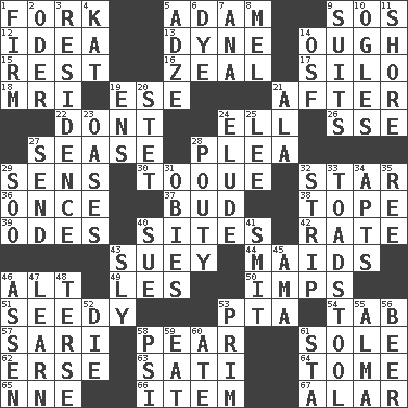 ACROSS 1. Tined utensil 5. First man 9. Distress signal 12. The content of cognition 13. Unit of force 14. Ending for "Through" and "Enough" 15. Respite 16. Ardor 17. Grain storage tower 18. Medical imaging device (abbr.) 19. Compass dir. 21. Following 22. Do not 24. Pipe bend 26. Compass dir. 27. Gospel singer Marvin 28. Entreaty 29. Elected reps. 30. Woman's close-fitting hat 32. Play the lead 36. At one time in the past 37. Partially opened flower 38. Drink excessively 39. Lyric poems 40. Locates 42. Assign a rank or rating to 43. Chop _ 44. Unmarried girls 46. Keyboard modifier key 49. French article 50. Naughty children 51. Morally degraded 53. Parent Teacher Assoc. 54. Keyboard key 57. Indian skirt 58. Lightbulb-shaped fruit 61. Flatfish 62. Celtic language 63. Suttee (variant) 64. Heavy book 65. Compass dir. 66. A distinct part 67. Having or resembling wings DOWN 1. Unshakable 2. Baltic tributary 3. Home 4. Krazy ___ of comics 5. Axlike tool, used for shaping wood 6. Color 7. Santa ___, CA 8. Cartoonist voice _ Blanc 9. Sets or collections 10. Stares at amorously 11. Dinah or Pauly 14. Order of Saint Francis (abbr.) 19. Followers of ems 20. Proofreading order 21. Chicken ___ king 23. Fertile tracts in a desert 24. Evade 25. Area sheltered from the wind 27. Post 28. Inclined to pout 29. "Barney Miller" actor Jack 31. Off-Broadway awards 32. Empty completely 33. Inedible or poisonous agaric 34. Tenement units (abbr.) 35. Portuguese money of account (variant) 40. Institute legal proceedings 41. Stricken, poetically 43. Mischievous 45. Nursemaid (var.) 46. NE Netherlands city 47. Acquire or gain knowledge or skills 48. Laconic 52. Expire 53. Demure 55. _ mater 56. Fermented drink made from hops 58. 23rd letter of the Greek alphabet 59. Erode 60. Had dinner 61. R.R. building