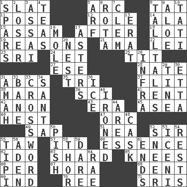 ACROSS 1. Narrow board 5. Curve 8. Make lace 11. Introduce or present, as a question 12. Hero or heavy, e.g. 14. Wing 15. Indian state 17. Following 18. Car dealer's back yard 19. Thinks logically 21. Nursemaid (var.) 22. Flowery wreath 23. _ Lanka 24. Allow 25. Teat (slang) 27. Compass dir. 28. Nathan's nickname 31. Lettered men learn these first 35. Three (prefix) 37. Secret move to avoid paying debts 38. Hindu Mythology: god of death 39. _-fi 41. Monthly bill 42. Soon (poet.) 43. Period 45. At sea 46. Behest 47. The grampus (Milton) 49. Plant excrement 51. Teachers' org. 52. Title for a knight 55. The 23rd letter of the Hebrew alphabet 57. It would 60. Center 62. Wedding promise 63. Broken piece 65. Leg joints 66. For each 67. Israeli folk dance 68. Incision 69. Working for oneself (abbr.) 70. Portuguese money of account (variant) 71. Indian titles of respect DOWN 1. Practice fights 2. Failure 3. Slender Brazilian palm 4. Beverages made from leaves 5. Sandy's bark 6. Round or rotation of duties 7. To starve (Brit.) 8. Baron Munchausen's specialties 9. _ vera 10. Jacques of French films 13. Part of Q.E.F. 16. Undercover agent 17. Michaelmas daisies 20. A home for chicks 26. Kind of red light 29. Prong on a fork 30. Singer James 31. Housemaid 32. Object of repulsion 33. What you're doing now 34. Before Barbara or Clara 36. Frozen water 40. Pressed 44. Ancient Greek god of war 48. Keg 50. Expression of disdain 52. Scornful expression 53. Ancient Celtic tribe of eastern Britain 54. Musical pauses 55. Native american tent (variation) 56. An important port of Yemen 58. Son of Odin 59. Have the gumption 61. Extremities 64. Actress Charlotte