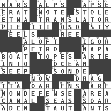 ACROSS 1. Armed conflicts 5. High mountains 9. Domed church section 13. Part of Q.E.F. 14. Musical sound 15. Took without asking 16. Inactive volcano in Sicily 17. Interpreter 19. Sliced dessert 20. One more than two 21. Bear (Spanish) 22. Filthy place 23. Snakelike fish 25. To separate or throw off 26. Upward 30. Russian composer Stravinsky 34. Stone: prefix 35. California wine valley 36. Water vessel 39. Drinks excessively 42. Johnson of "Laugh-In" 43. To the inside or interior of 44. Sea 46. Ooze 47. Message 48. At this time 51. To be drawn or hauled along 54. Call ___ day 57. Rowing implement 58. Followers of ems 60. "We ___ not amused" (Victoria) 62. Unrelated to defense, as in spending 65. Length times width 66. Lessep's creation 67. Oceans 68. Fly high 69. Arabian gulf 70. Pulled tight 71. Pismires DOWN 1. Shed a tear 2. Nick name for Arthur 3. The wife of a rajah (variant) 4. R.R. building 5. Against 6. Australian parrot (variant) 7. Parent Teacher Association (abbr.) 8. Sir (Sp.) 9. _ moment's notice (2 wds.) 10. Plant holders 11. Narrow, elongated depression 12. Suggestive of the supernatural 15. _ gin 18. Compass dir. 20. Capri or Wright 24. Portable computer 27. Baseball player Mel 28. From 29. Literary convention 30. Sillier 31. Slender fish 32. Choose 33. Actress Charlotte 36. Twice 37. Single 38. Had dinner 40. Environmental prefix 41. Elected rep. 45. Does sums 48. Christmas carol 49. Clumsy lout 50. Obtain by seizing forcibly or violently 52. Composer Copland 53. Relatively large 54. South American Indian 55. Frog relative 56. Queen of England 1702-14 58. Son of Isaac 59. Egg locale 61. Hearing organs 63. One of the 12 tribes of Israel 64. Teachers' org. 65. White ___ sheet