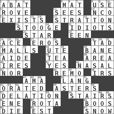 ACROSS 1. Blind as ____ 5. Floor covering 8. Purpose 11. Be footloose 12. Perceives with the eye 13. Non-commissioned officer (abbr.) 14. Is 17. Ski resort town in Vermont 19. Moe Howard, for one 21. Foolish or stupid persons 22. Play the lead 23. Car or cant ending 24. Adept person 27. Greek god of love 29. Small boy 32. Shopping centers 34. Shoshoni 36. Object of repulsion 37. Helper 38. Afternoon social gathering 39. Type of rug 40. Angers 41. Consenting reply 42. Rhinal 43. Or not 44. San ____ (Riviera town) 46. Big collection agency 47. Nursemaid (var.) 50. Austrian-born American filmmaker Fritz 52. Declaimed 55. Michaelmas daisies 57. Conveyance 59. Flight of steps 62. Compass dir. 63. Roll call or roster of names 64. Scornful sounds 65. Expire 66. Eastern Standard Time (abbr.) 67. Frozen precipitation DOWN 1. "We ___ not amused" (Victoria) 2. Gift holder 3. Deliberation 4. Trials 5. Was introduced to 6. Nest on high 7. Sadhe (variant) 8. To (old English) 9. Native of Scotland 10. Immeasurably long periods of time 12. Compass dir. 15. Lugs 16. Fly high 18. Shallow baking pan 20. Sullen 24. With great haste 25. Capital of Egypt 26. A person who is older than you are 28. Guide 29. Tarsus (plural) 30. Approach 31. Allots cards 33. French article 35. Artist's stands 36. Sound made by sheep 42. Music written for nine 45. Floor protectors 47. _ moment's notice (2 wds.) 48. Distance measurement (Brit.) 49. Goodbye (Sp.) 51. Catches 52. Wrote a lyric poem 53. Painter Guido (1575-1642) 54. Toward shelter 55. Santa ___, CA 56. The Jewish people; Israel 58. Baseball player Mel 60. Friend of Pooh 61. Compass dir.