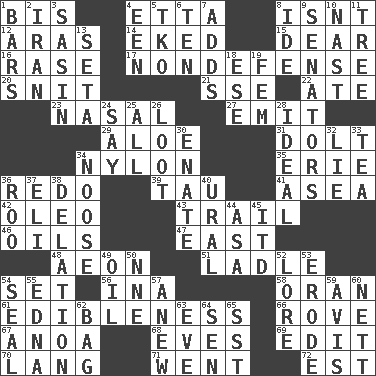 ACROSS 1. Altar cloth linen 4. Singer James 8. Is not 12. Ancient river in northeast Turkey 14. Supplemented with great effort 15. Letter starter 16. To erase 17. Unrelated to defense, as in spending 20. In a ____ (agitated or irritated) 21. Compass dir. 22. Had dinner 23. Rhinal 27. Give off 29. _ vera 31. Stupid person 34. Thermoplastic polyamide 35. One of the Great Lakes 36. Redecorate 39. The 19th letter of the Greek alphabet 41. Toward the sea 42. Margarine 43. Lag or linger behind 46. Petroleums 47. 90 degrees 48. Age 51. Dipping utensil 54. Put into a specified state 56. _ tizzy (2 wds.) 58. NW Algerian seaport 61. The property of being fit to eat 66. Be footloose 67. Small Philippine buffalo 68. Nights before holidays 69. Prepare for publication 70. Long (Scottish) 71. Left 72. Eastern Standard Time (abbr.) DOWN 1. Drinking establishments 2. SW Asia republic 3. Indian antelope 4. Car or cant ending 5. Ring climax 6. Nine, plus one 7. Does sums 8. Binary compound 9. Elected representatives 10. Political cartoonist Thomas 11. Relationship diagram 13. Bristle 18. Compass dir. 19. Opposite of masc. 24. Declare 25. 100% 26. Spoils 28. Standard of perfection 30. Maternal 32. Falsehood 33. Beverage made from leaves 34. Trap for birds or small mammals 36. Friend of Pooh 37. Biblical high priest 38. Conveyance 40. Mountain range 44. White ___ sheet 45. It would 49. Lubricate 50. Compass dir. 52. Old wives' tales, e.g. 53. Eat (away) 54. Lick closed 55. Pulitzer Prize-winning author Ferber 57. Afresh 59. Opinion 60. Remaining after all deductions 62. Paper or plastic container 63. Night before a holiday 64. Elected rep. 65. Fast jet (abbr.)